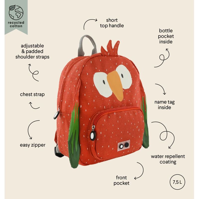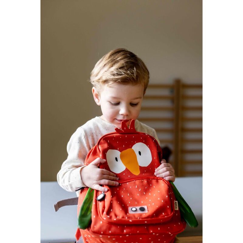 With this cute backpack your child is completely ready for any adventure or first trip to school! The backpack has adjustable and padded shoulder straps and a short handle at the top to easily hold and hang it everywhere you go. The chest strap prevents the shoulder straps from falling down. The backpack has a big compartment and a little front pocket, where you can nicely store a little snack or so. The main and front pocket have a zipper that allows children to easily open and close the backpack themselves. In order not to loose your traveling companion, a name tag is provided on the inside of the bag. Furthermore, the backpack is water repellent and can be washed in the washing machine in a gentle rinse. But be informed that the more you wash the bag, the less water repellent it will get.