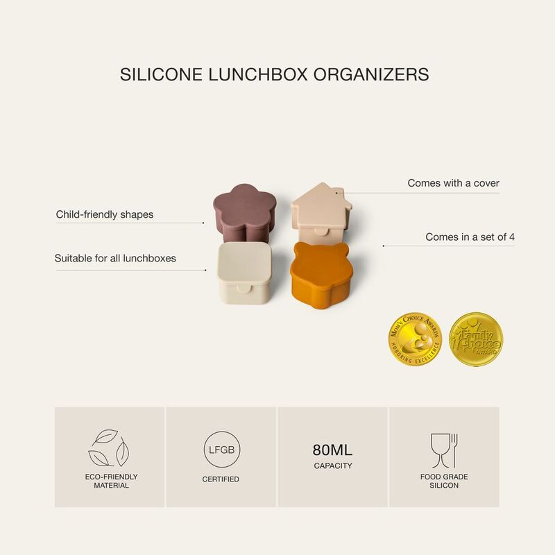 - Set of four silicone lunchbox organisers with lids in fun, child-friendly shapes