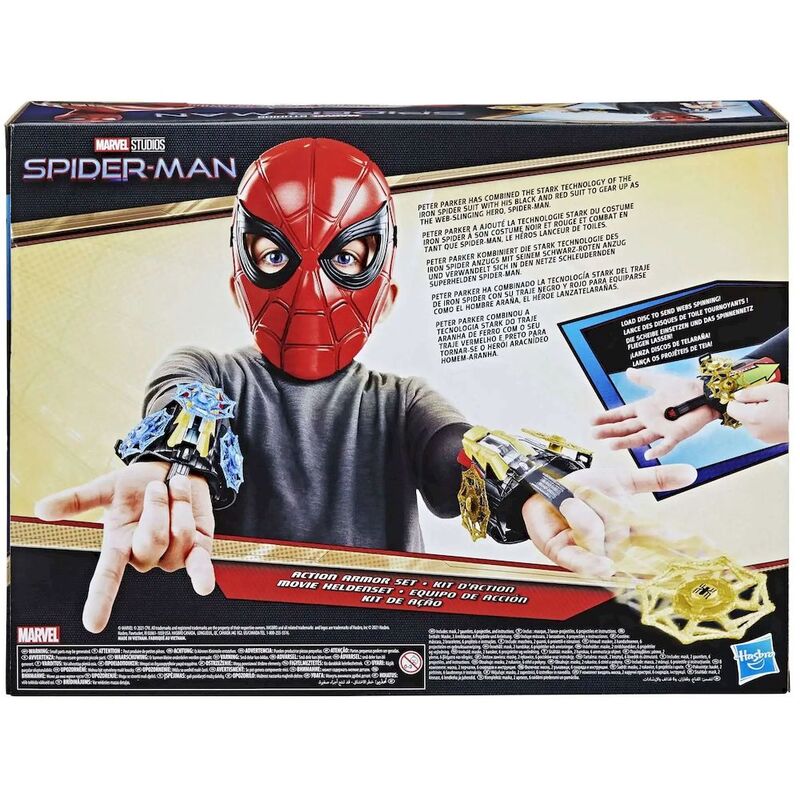 - Spider-Man Action Armor Set with mask, 2 gauntlets and 6 webs that spin is inspired by the iconic character from the Marvel Cinematic Universe