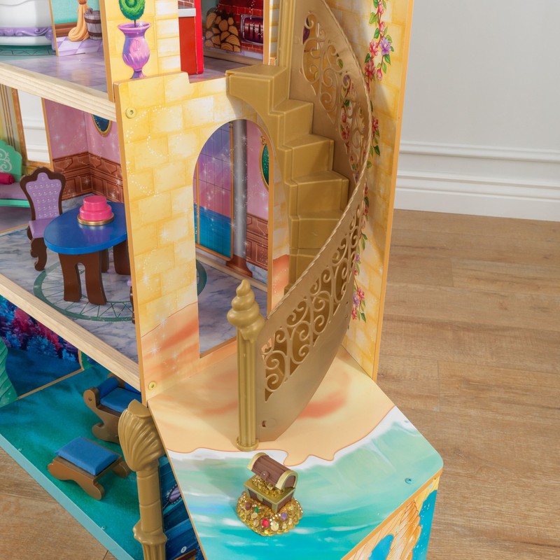 The Disney Ariel Undersea Kingdom Dollhouse by KidKraft is truly fit for a princess! This dollhouse is simply massive! Standing five feet tall, four levels and with a whopping 11 areas of play. The above sea-level play-areas include a den, a bedroom, two balconies, and a beachside winding staircase. Submerged you will find an undersea throne chamber, and the treasure grotto where Flounder stored the Prince Eric statue.