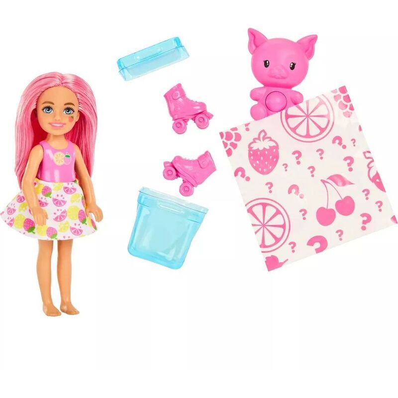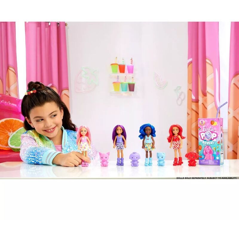 - With 5 surprises in one cute juice box package, Barbie Pop Reveal Fruit Series Chelsea small dolls deliver a scented unboxing experience!