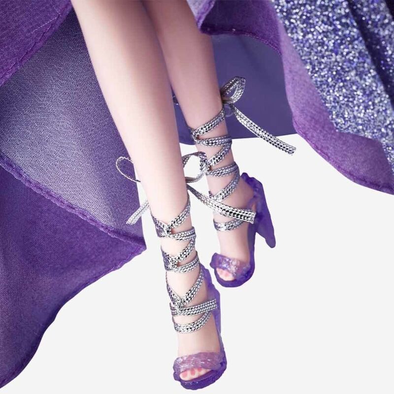 Widely regarded for its spiritual and healing properties, the amethyst stone comes to life with Barbie® doll dressed in a sweeping lavender chiffon gown with a glittering sash delicately tied at the waist. She emits pure energy with a genuine amethyst stone necklace, fragmented crystal-inspired bracelets and enchanting makeup. A crown resembling gathered shards of amethyst adorns her upswept, platinum ponytail with soft lavender highlights.