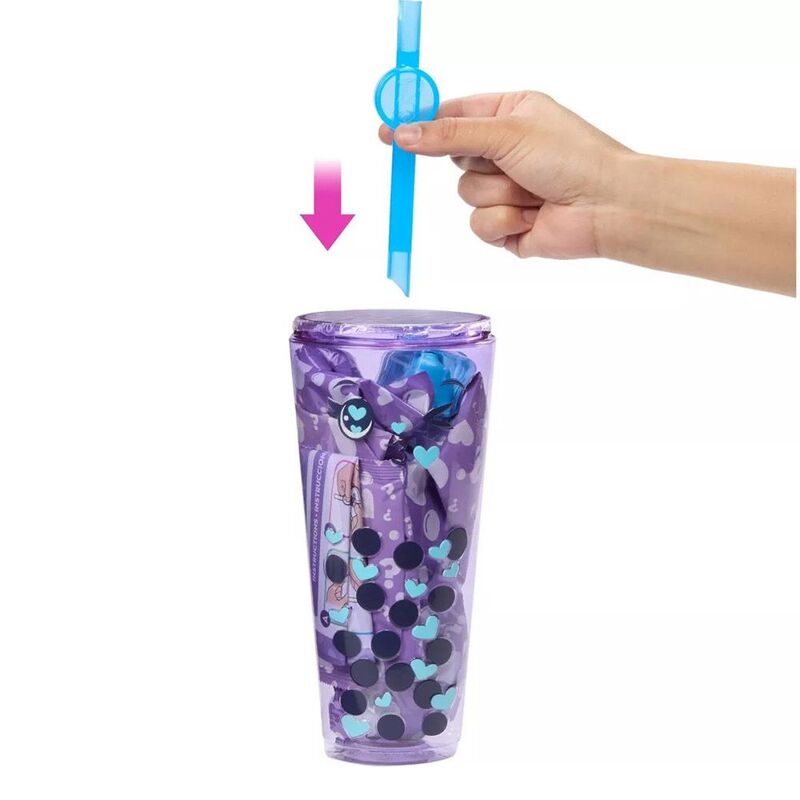 • Open the package by peeling the film on the cup to reveal a Barbie fashion doll with a boba tea-themed scent, like Taro Milk, Berry Bliss, Green Tea or Mango Mochi which doll will you reveal?