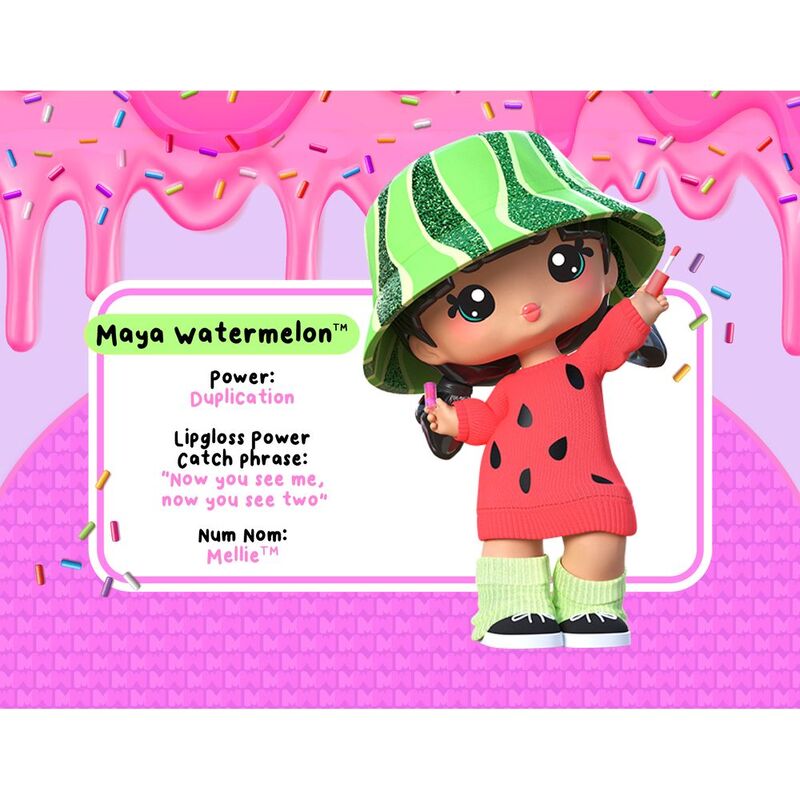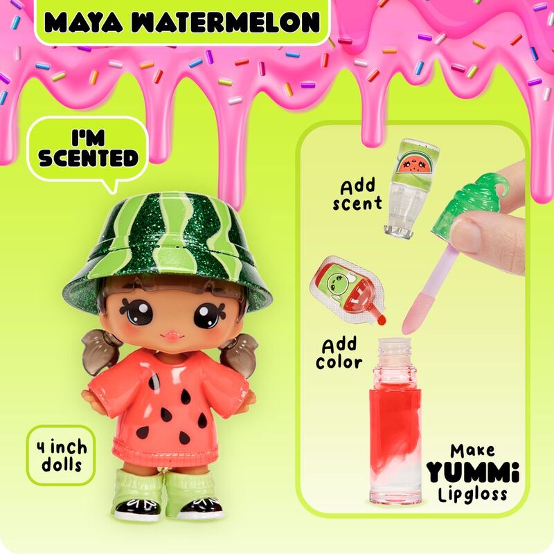 Welcome to Yummiland, where six brave Yummis team up to protect their incredible, edible city with their lip gloss superpowers! Join them on their adventures by creating and customizing your own real lip gloss! Each includes base, color and scent to mix together your very own shimmery gloss! Take your Yummi doll and lip gloss on the go by attaching the included key chain. These scented dolls are articulated and feature removable fashions and accessories so you can customize!