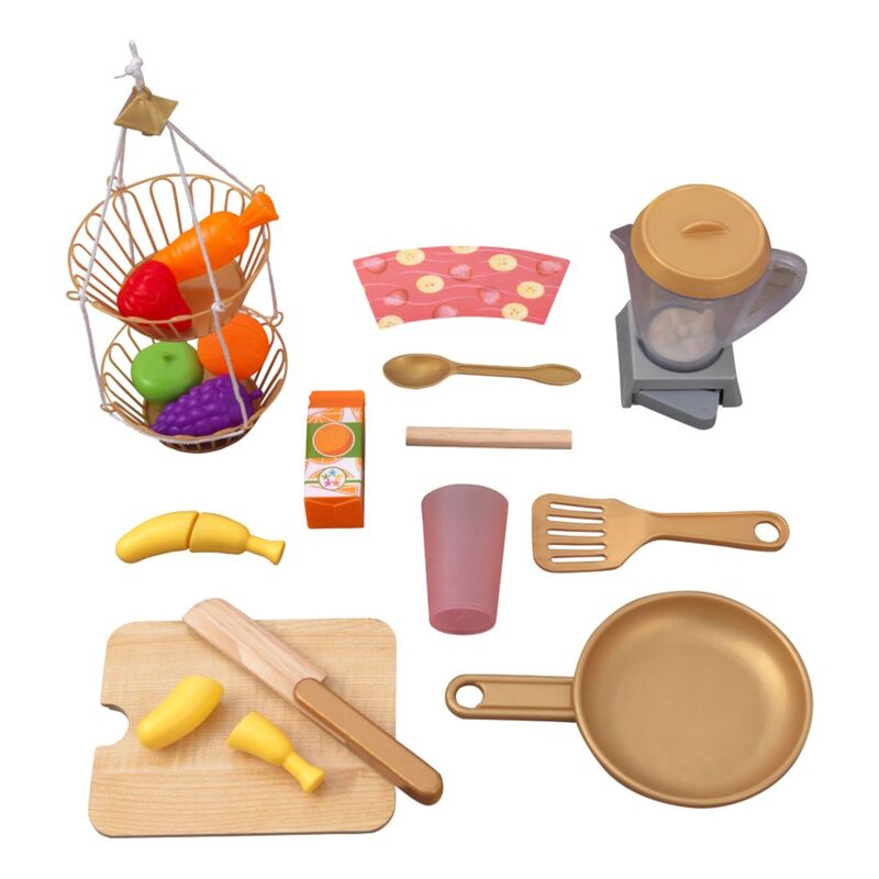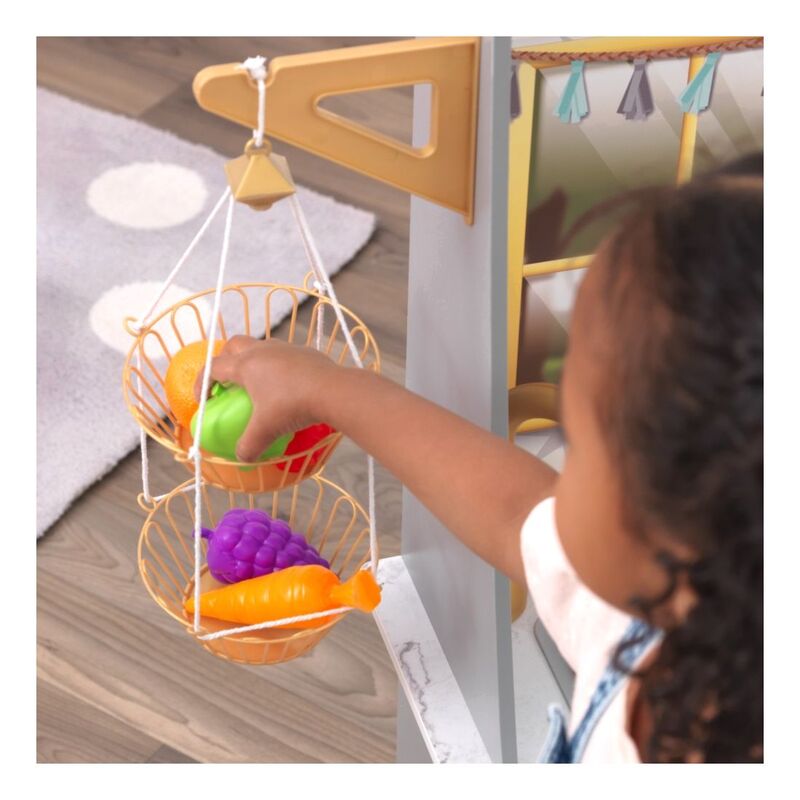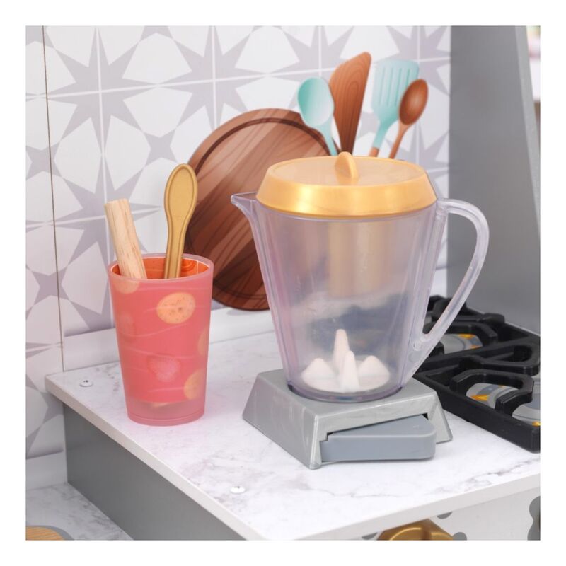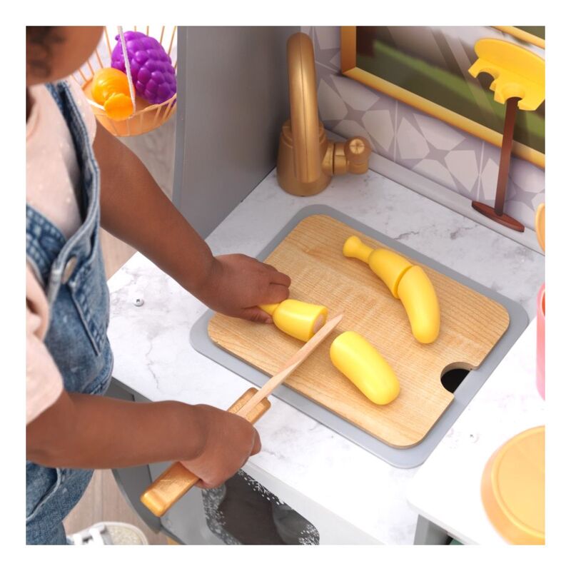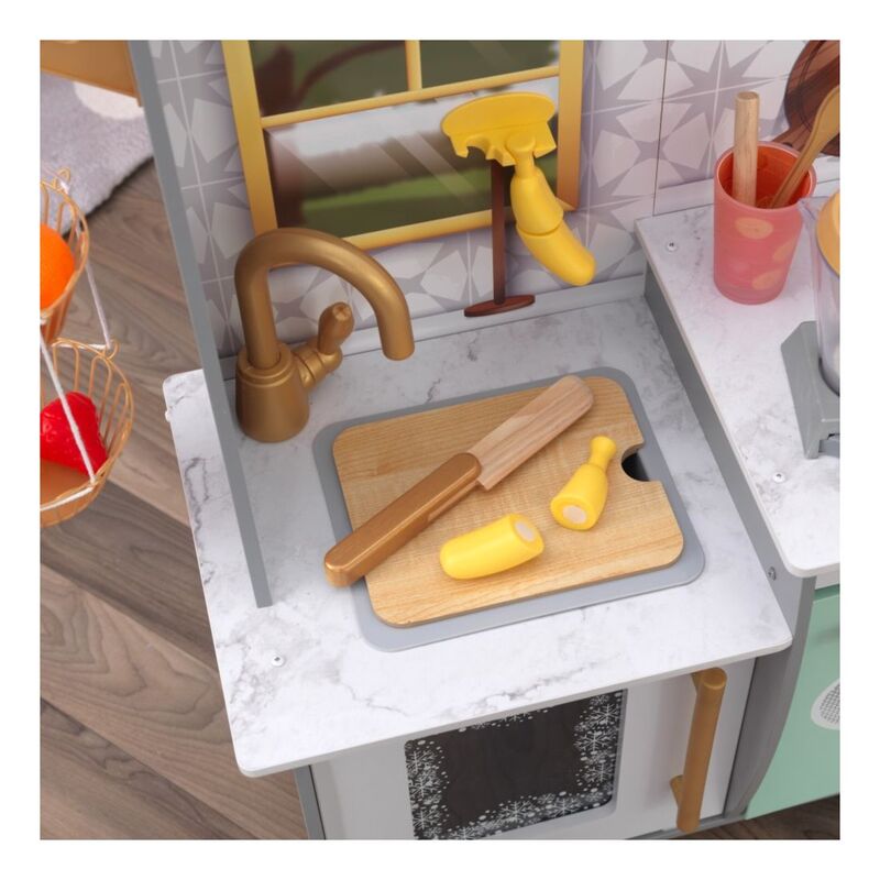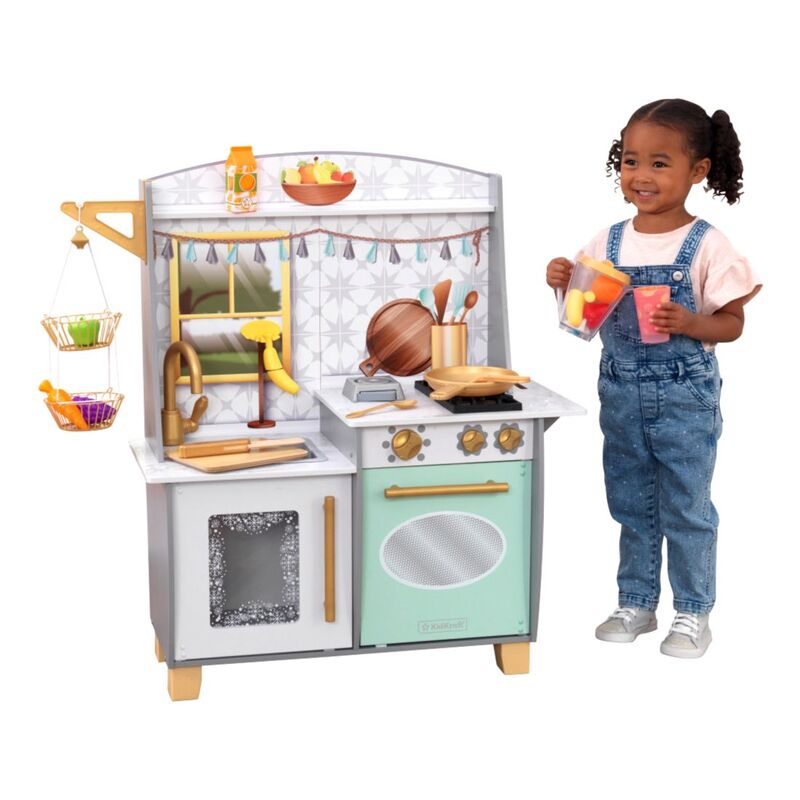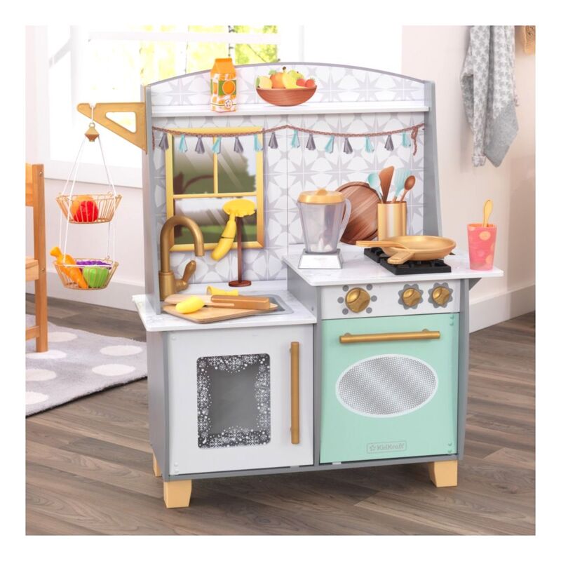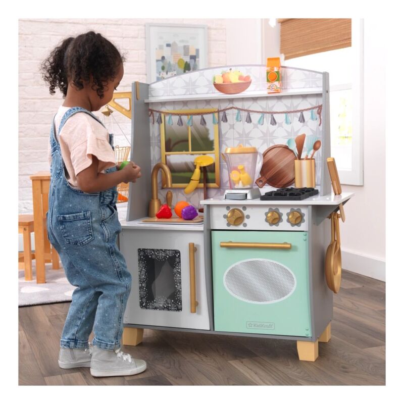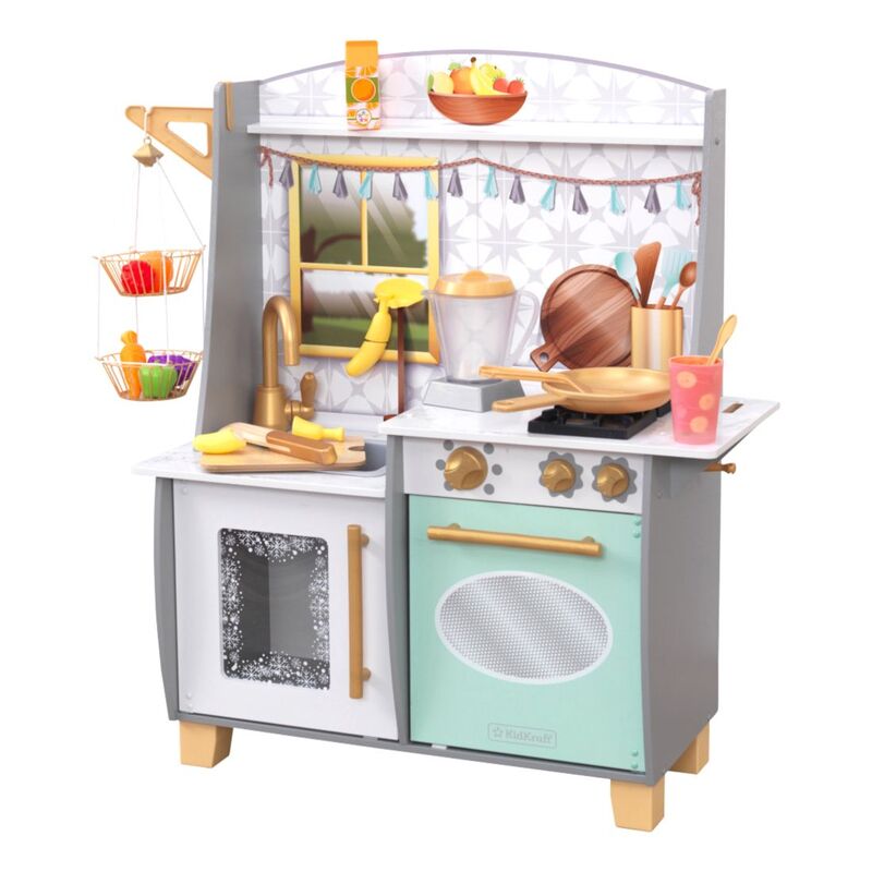 Blending imagination and play, the KidKraft Smoothie Fun Play Kitchen takes a healthy approach to role playing. A refreshing color scheme with golden accents mixes in nicely with your home's décor. Kids will love tossing in all the pretend fruit and veggies, pouring in some juice and pressing the button on the blender to see and hear it all spin around. And of course, there's the usual playing and learning of clickable knobs, opening doors and moveable faucet handle to keep little ones' hands busy. With everything included to whip up healthy smoothies, kids can chop, blend, and pour fruity drinks for themselves and friends any time.