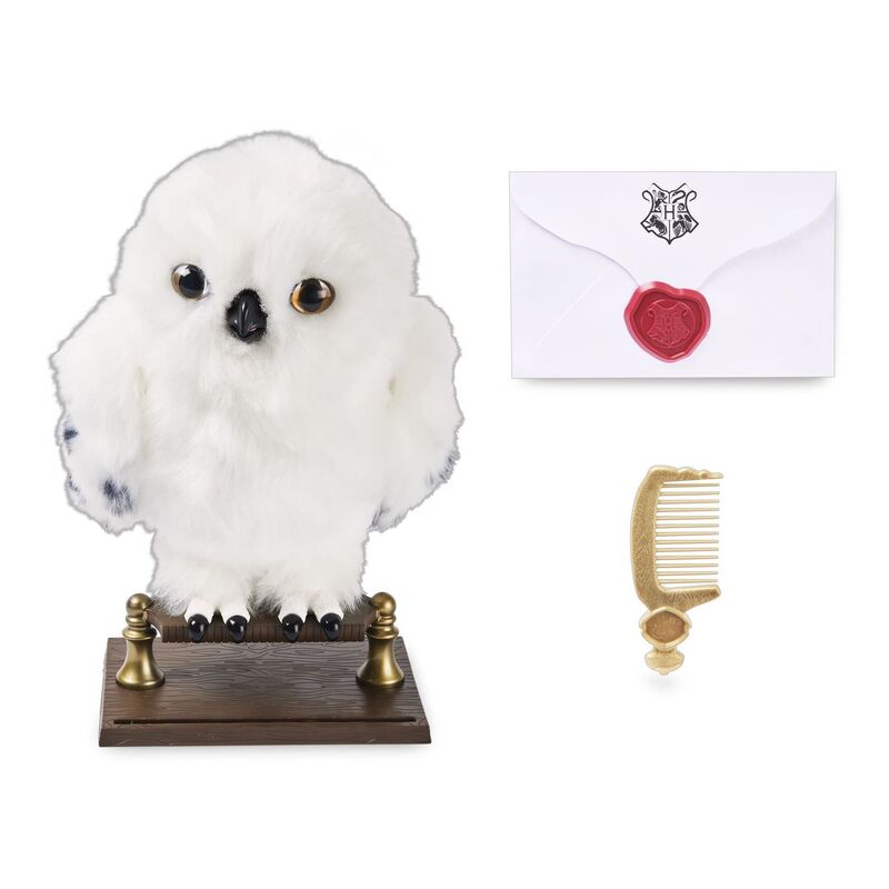 Wizarding World 9-inch. Enchanting Hedwig (12-inch on her included perch) is a great gift for kids. She also includes a comb for her beautiful feathers and 3 AA Duracell batteries.