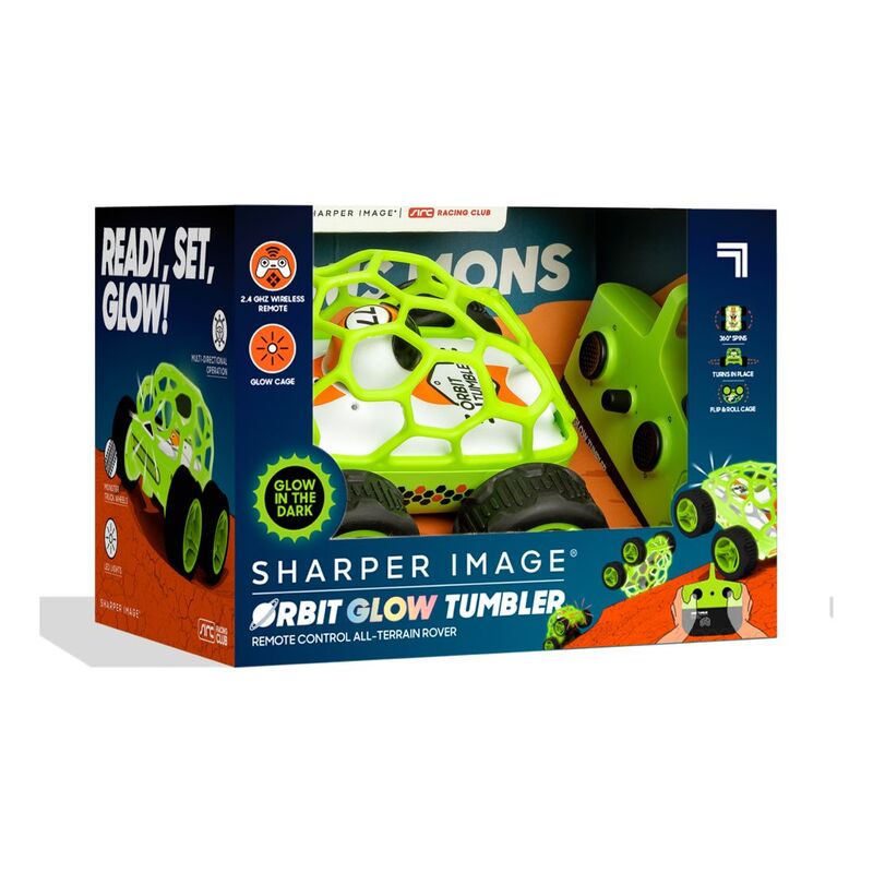 Orbit Tumbler Remote Control all-terrain Rover from Sharper Image. Perform rolling flips and tumbles with this rugged design. Go off-road with monster truck wheels. Light up the night with a cage that glows in the dark. Features LED lights, multi-direction operation, and wireless control.