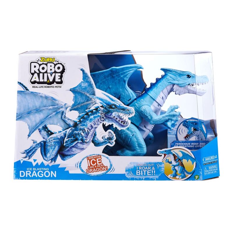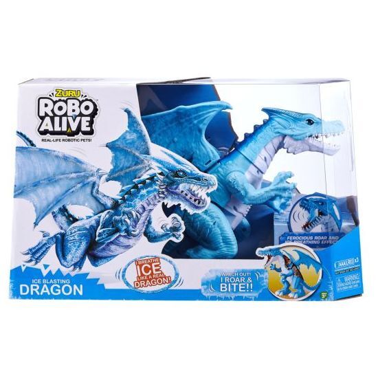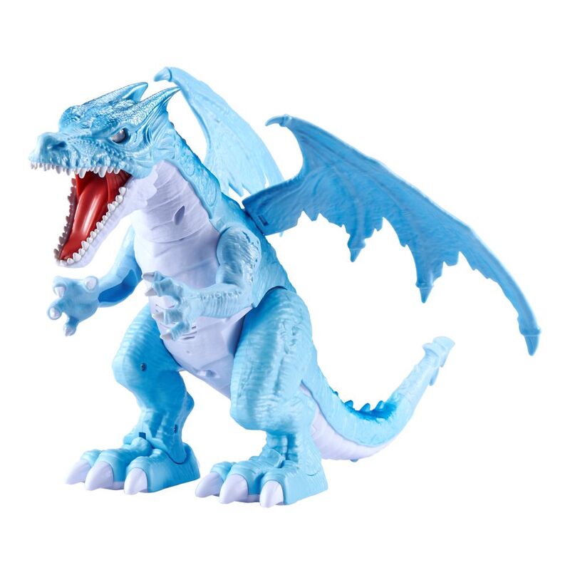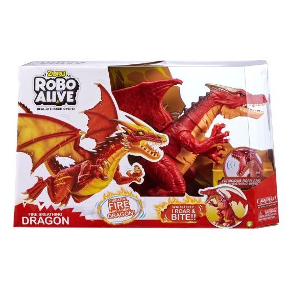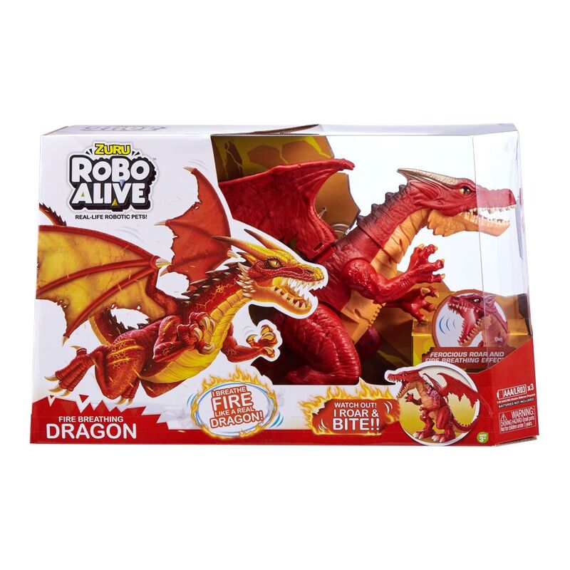 The Robo Alive Ferocious Dragon Robotic Toy (Colors May Vary) moves and acts like it's real. Features light-reflecting eyes and moving lower jaw for biting action. Walks, roars and has fire breathing effects. Realistic design and advanced robotics to give it life-like movements.