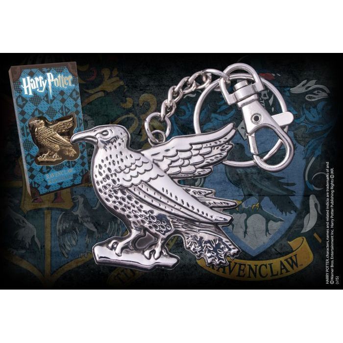 A die cast metal keychain of the Ravenclaw House mascot, the raven. The keychain is presented in a Harry Potter-branded card and window box in Ravenclaw blue.