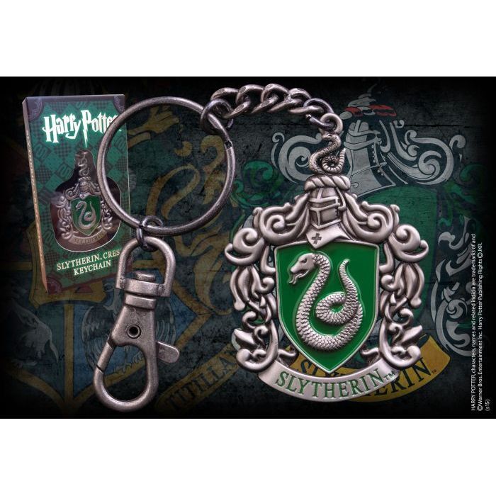 A die cast metal keychain of the Slytherin house crest, finished with green enamel detailing. The keychain is presented in a Harry Potter-branded card and window box in Slytherin green.