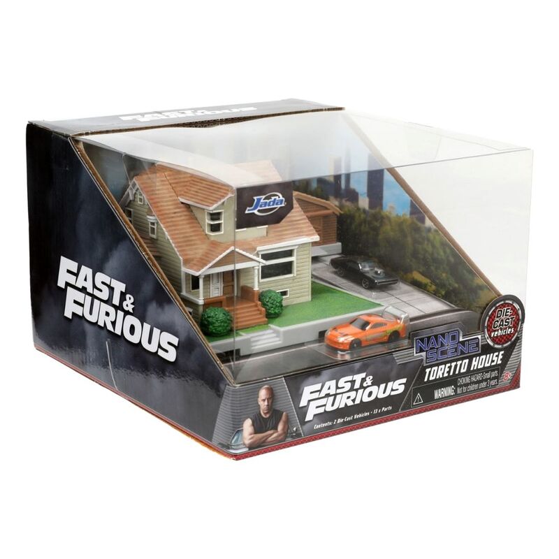 Real rubber tires, detailed exteriors. Officially licensed product. Manufacturer's original unopened packaging. Made of diecast metal with some plastic parts. Toyota Supra dimensions approximately L-1.5 inches. Dodge Charger dimensions approximately L-1.75 inches. House dimensions approximately L-3.5, W-3.25, H-2.5 inches. Please note that manufacturer may change packing box at any time. Product will stay exactly the same.