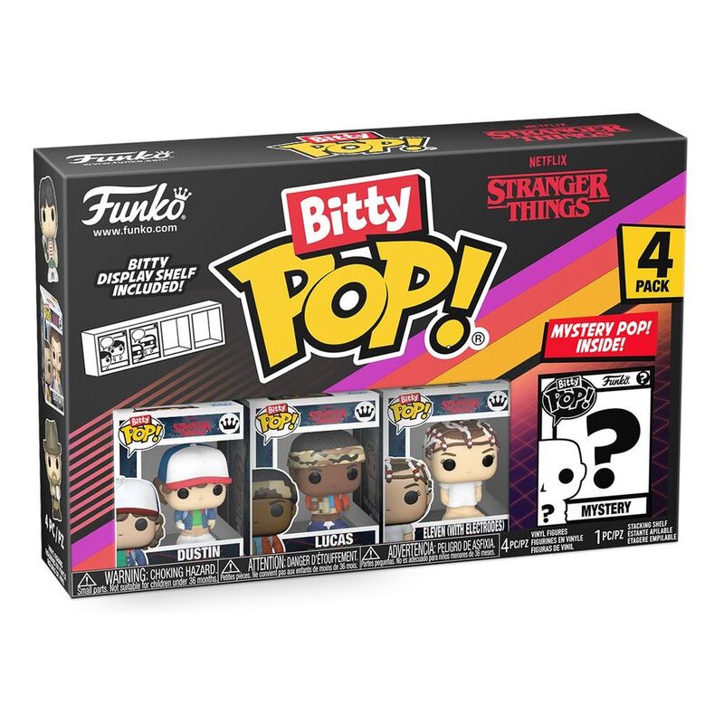 Your favorite Stranger Things Pops! have been shrunk into Bitty Pops! Expand your collection with this assortment of Bitty Pop! figures featuring your most beloved heroes and monsters as miniaturized figures! This 4-pack includes Bitty Pop! Dustin, Bitty Pop! Lucas, Bitty Pop! Eleven (with Electrodes), and a mystery Bitty Pop! figure. The possible mystery Bitty Pops! are Hyper Rare (1/6) Upside Down Barb, Hyper Rare (1/6) Eleven Underwater, Rare (1/3) Upside Down Will, and Rare (1/3) Eleven with Eggos and Wig.