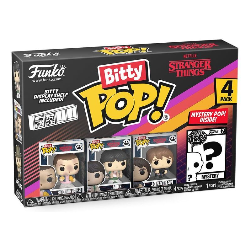 Your favorite Stranger Things Pops! have been shrunk into Bitty Pops! Expand your collection with this assortment of Bitty Pop! figures featuring your most beloved heroes and monsters as miniaturized figures! This 4-pack includes Bitty Pop! Eleven with Eggos, Bitty Pop! Mike, Bitty Pop! Jonathan, and a mystery Bitty Pop! figure. The possible mystery Bitty Pops! are Hyper Rare (1/6) Upside Down Barb, Hyper Rare (1/6) Eleven Underwater, Rare (1/3) Upside Down Will, and Rare (1/3) Eleven with Eggos and Wig.