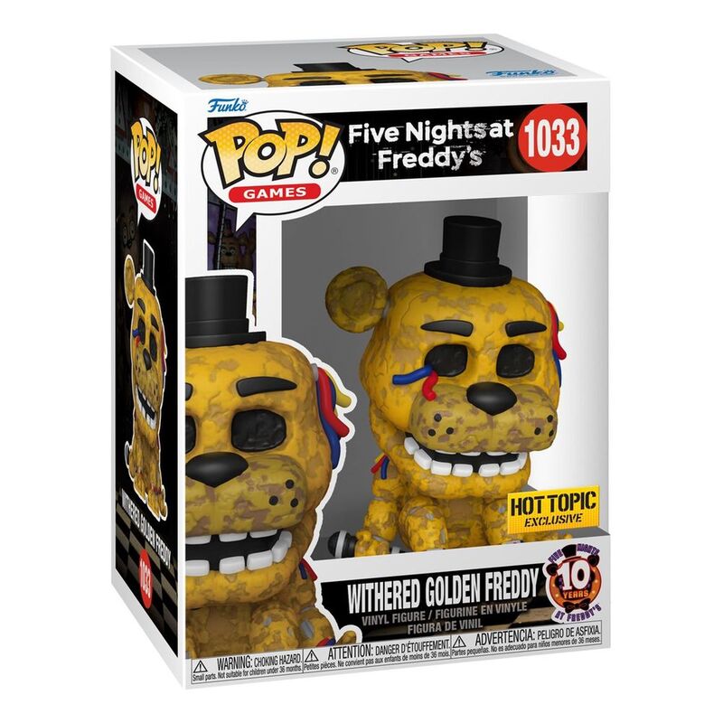 Give your collection a jumpscare with Pop! Withered Golden Freddy! Celebrate 10 Years of Five Nights at Freddy’s™ and complete your collection by closing in on this exclusive Pop! Withered Golden Freddy before he moves! Vinyl figure is approximately 3.9-inches tall.