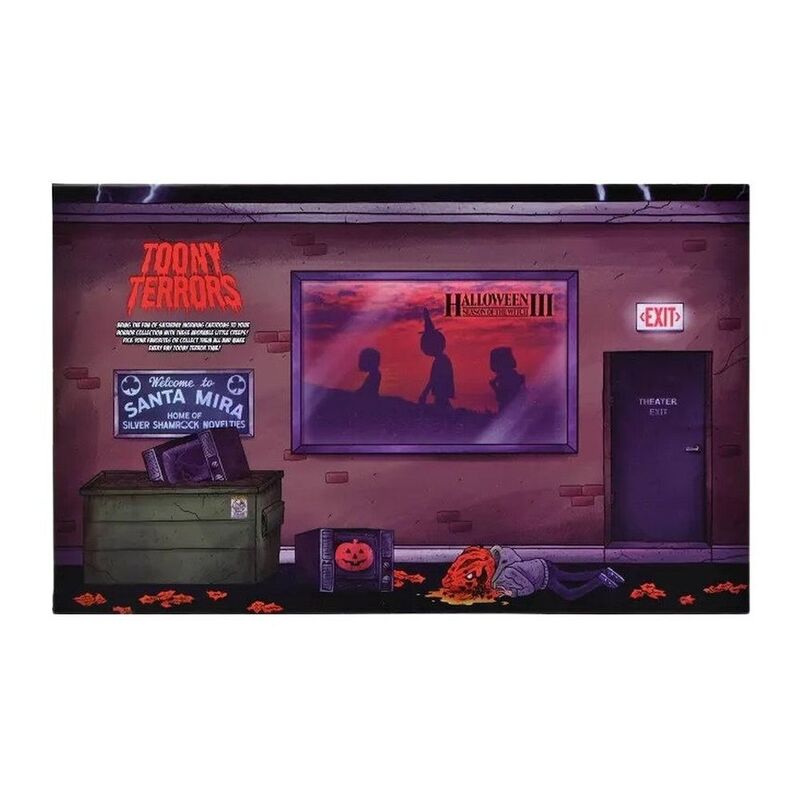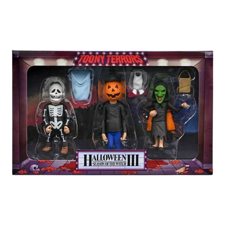 “It’s almost time, kids! The clock is ticking!” NECA’s adorably creepy Toony Terrors line welcomes Halloween 3: Season of the Witch! Bring the fun of Saturday morning cartoons to your collection with this stylized action figure 3-pack. It contains 6” scale versions of the iconic trick-or-treaters from the 1982 horror movie. Comes in window box packaging with a bonus cutout backdrop.