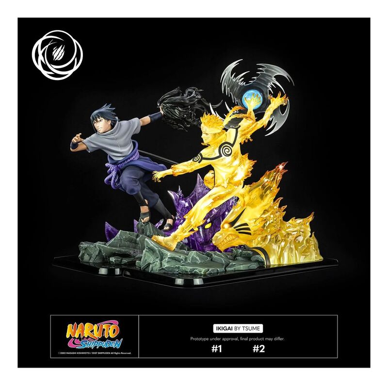 Heading straight towards Obito, who has become invulnerable as Juubi’s receptacle, we see here Naruto - 4th War Ikigai combining his Wind Release - Futon Rasen Shuriken attack with his rival Sasuke’s Enton Kagutsuchi, determined to annihilate their common enemy together. In an ultra dynamic pose, he is using the Kyuubi’ Chakra mode transcribed thanks to the characteristic symbols of his outfit and his flamboyant figure in fiery shades. With his right hand, he prepares his attack, being the Wind Element technique he created after understanding the Futon’s principles by merging it with his Rasengan. The rocky landscape of the base brings us back to the battlefield of the 4th Great Ninja War, while the Bijuu Kyuubi’s head symbolizes its connection to Naruto and the power and shades they share together.