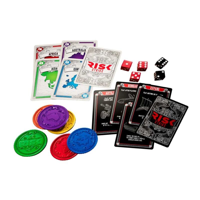 PLAY IN ABOUT 20 MINUTES: Enjoy all the intensity of the Risk board game in a fast-paced, easy-to-set up card and dice game! The Risk Strike strategy game can be played in as little as 20 minutes