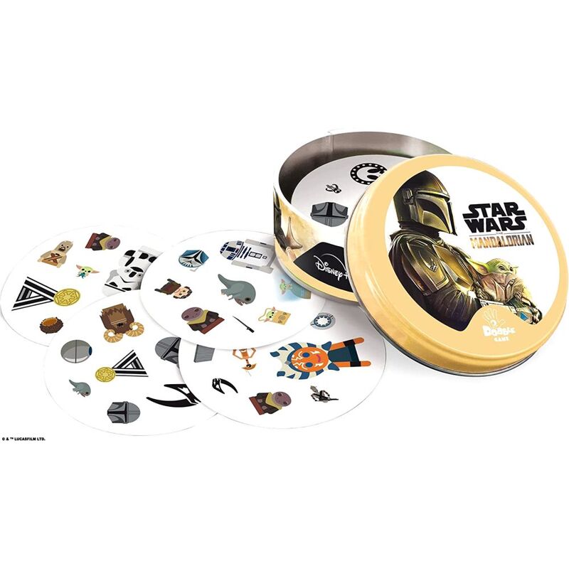 Spot It! is a speed and observation game for the whole family. The aim of the game? Each two cards have one symbol in common. Be the first to find and name it to win the card. This new version of Spot It! combines emblematic characters and objects from the series The Mandalorian with the beloved family game! Players try to spot the single matching symbol between two cards in a playful battle of speedy observation, featuring stylized imagery of The Mandalorian, Grogu, Ahsoka Tano, Kuiil and many more.