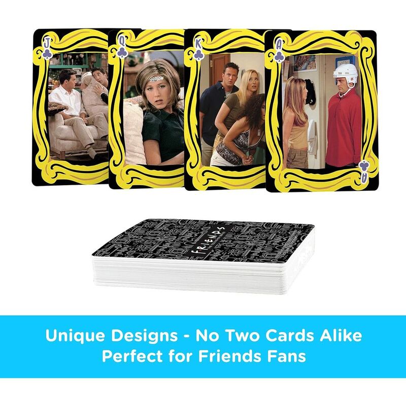 - UNIQUE DESIGN ON EVERY CARD: This Friends deck of playing cards includes 54 cards (52 playing cards and 2 jokers). Every single playing card features its own distinct Friends TV Series themed design and art. No two cards are alike