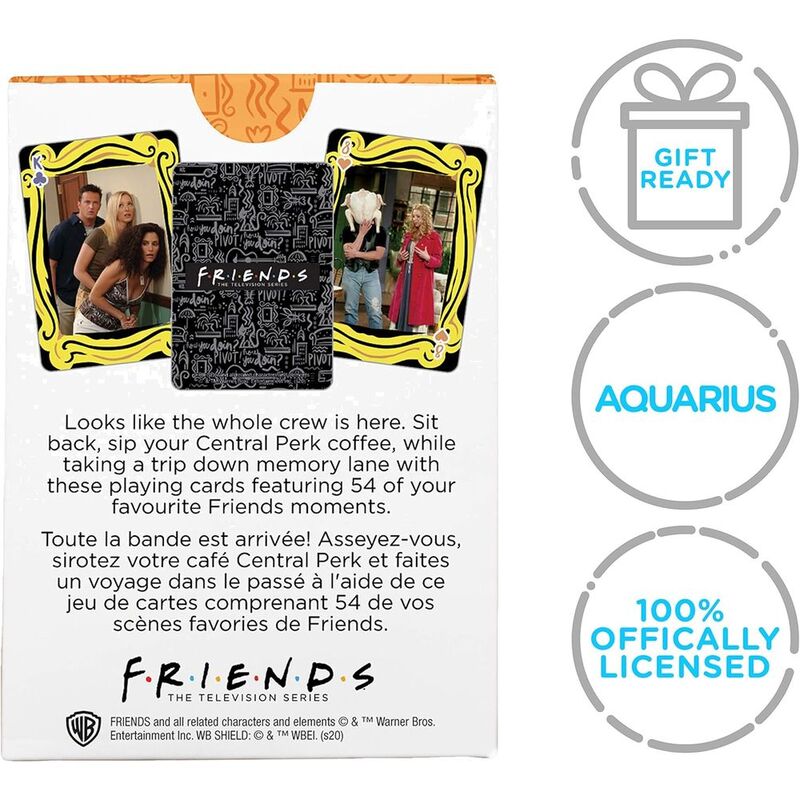 - 100% OFFICIALLY LICENSED FRIENDS MERCHANDISE: This deck of Friends playing cards is designed by AQUARIUS and officially authorized by Warner Brothers. They're the perfect piece of Friends memorabilia to add to your collection