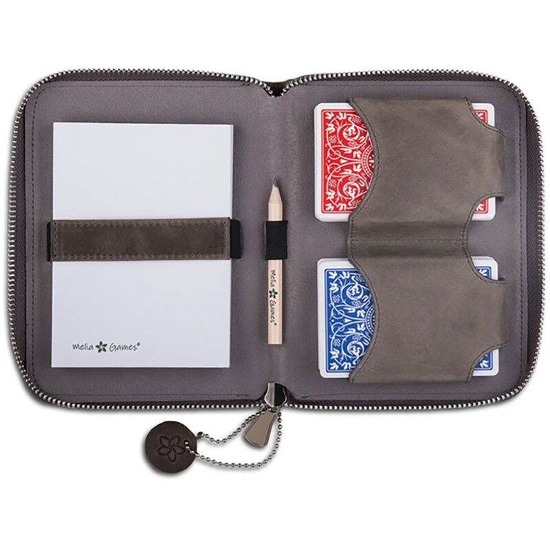 The handmade zip case has been crafted in sustainably-certified genuine full-grain leather. The zip case houses 2 decks of playing cards, perfect for rummy, canasta, bridge and more, a notepad and pencil for score keeping.