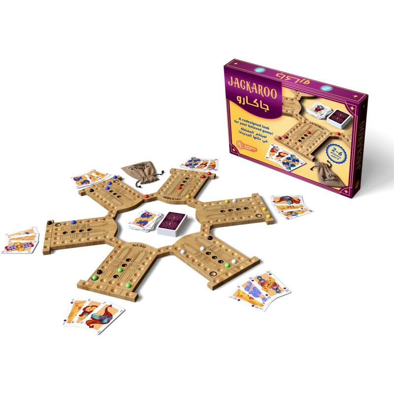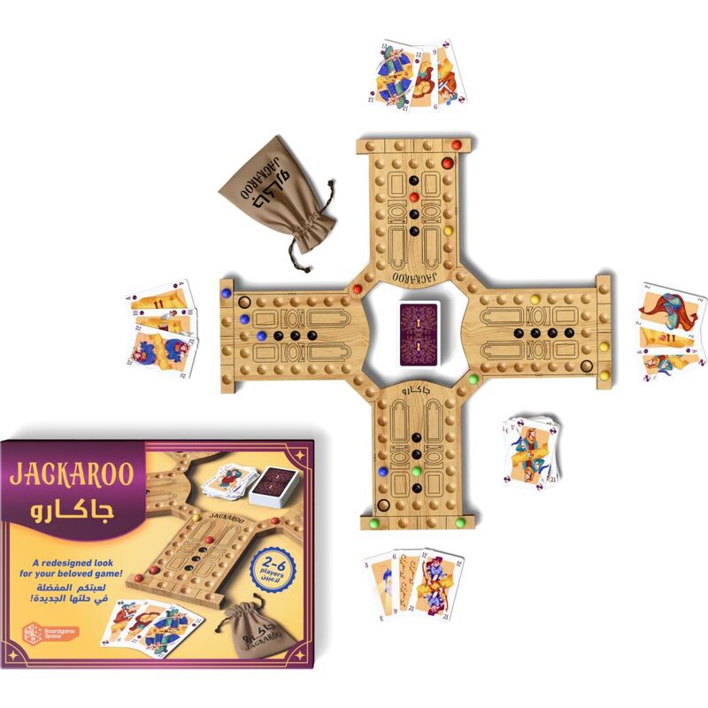 Jackaroo is a highly popular board game in the Middle East based on the mechanics of Ludo and Fast Track. The game is played with a deck of playing cards and elegant marbles. The goal of the game is to get all your marbles by moving them around the board, from your "Home" to your "Base".