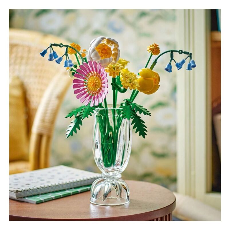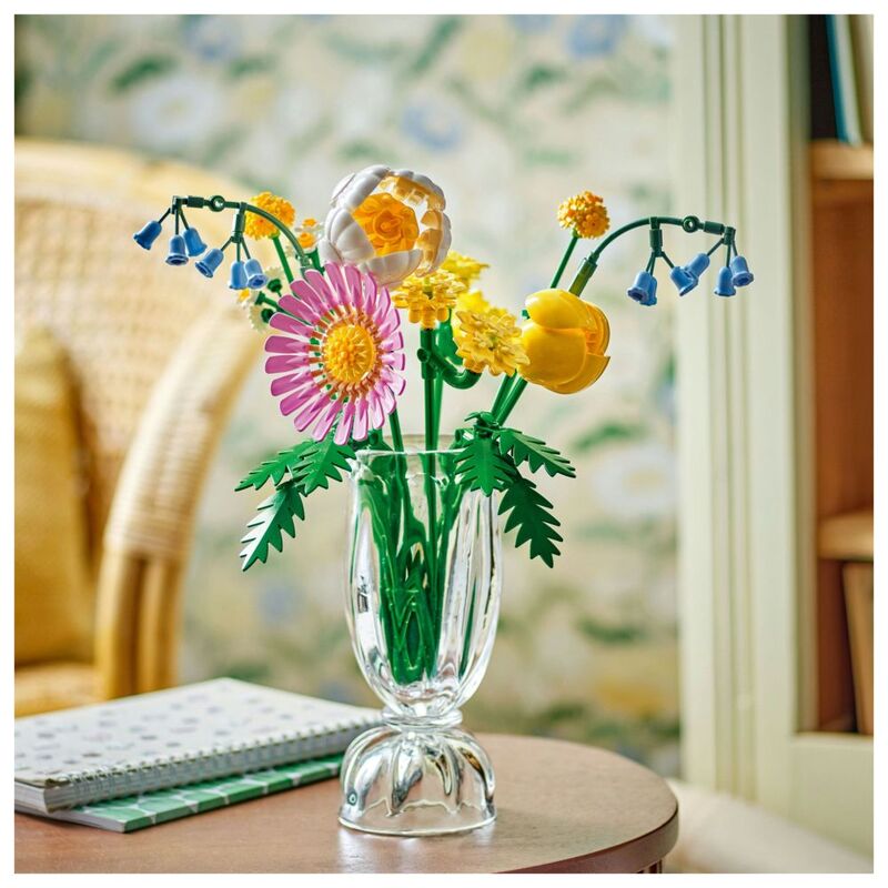- • LEGO® flowers – The bouquet blooms with 7 species of spring flowers in pastel shades, including Billy buttons, bluebells, Cleopatra ferns, yellow yarrows, a gerbera, a peony and a tulip