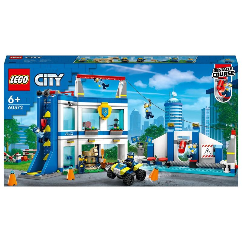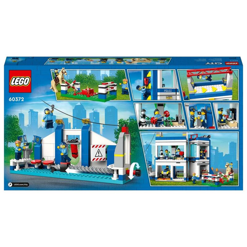 The LEGO® City Police Training Academy (60372) set features a modular multi-room police station and an outdoor obstacle course with fun facilities, including a toy climbing wall, monkey bars and a zip line. It also includes a steerable quad bike, 6 minifigures and a horse figure.