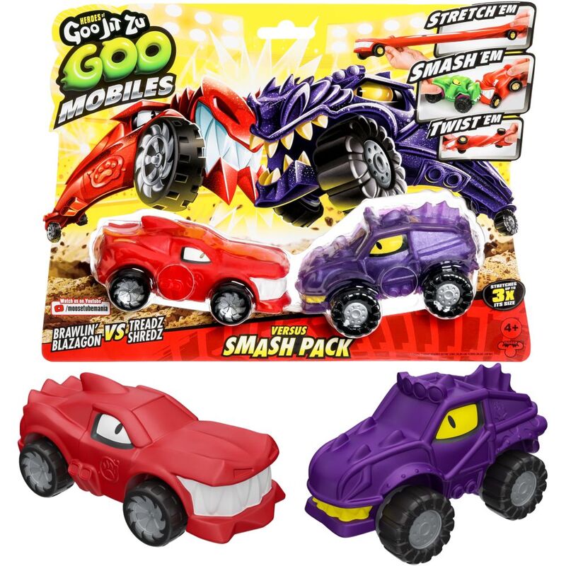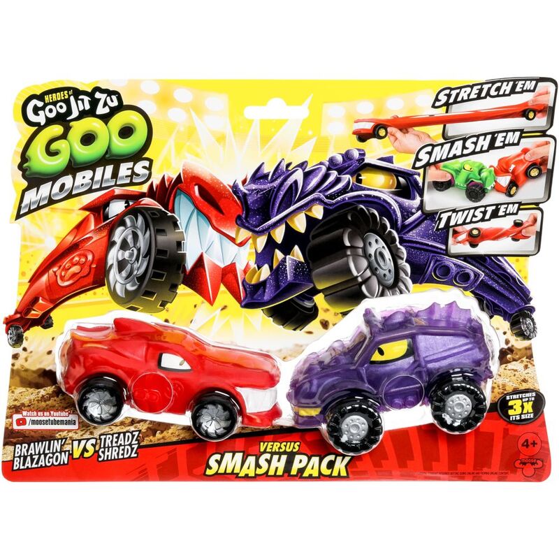 Heroes of Goo Jit Zu Goo Mobiles! Shape Shifting Rides made to collide! These stretchable, squishable cars move like nothing else on the road! Stetch Them! Smash Them! Twist Them! Fix Them and start again! These cars move like nothing else! In this awesome versus twin pack you’ll get an exclusive Brawlin’ Blazagon ready to take on Treadz Shredz! A brand new ALL-GOO way to play! Heroes of Goo Jit Zu Goo Mobiles! Goo Yah! Suitable from 4 years.
