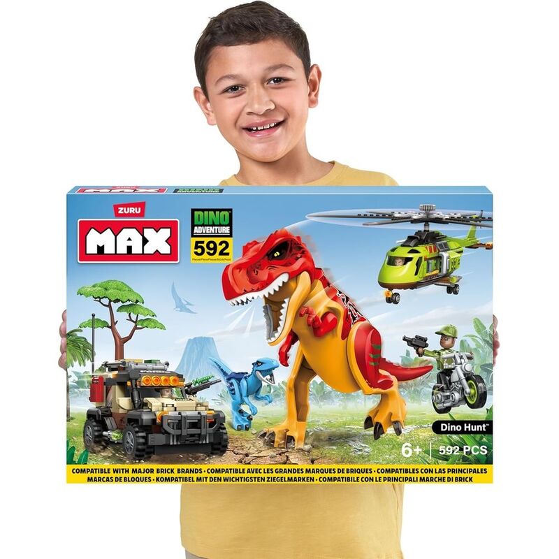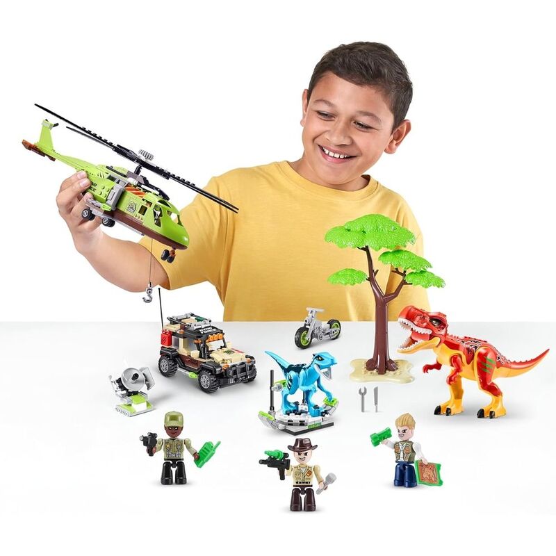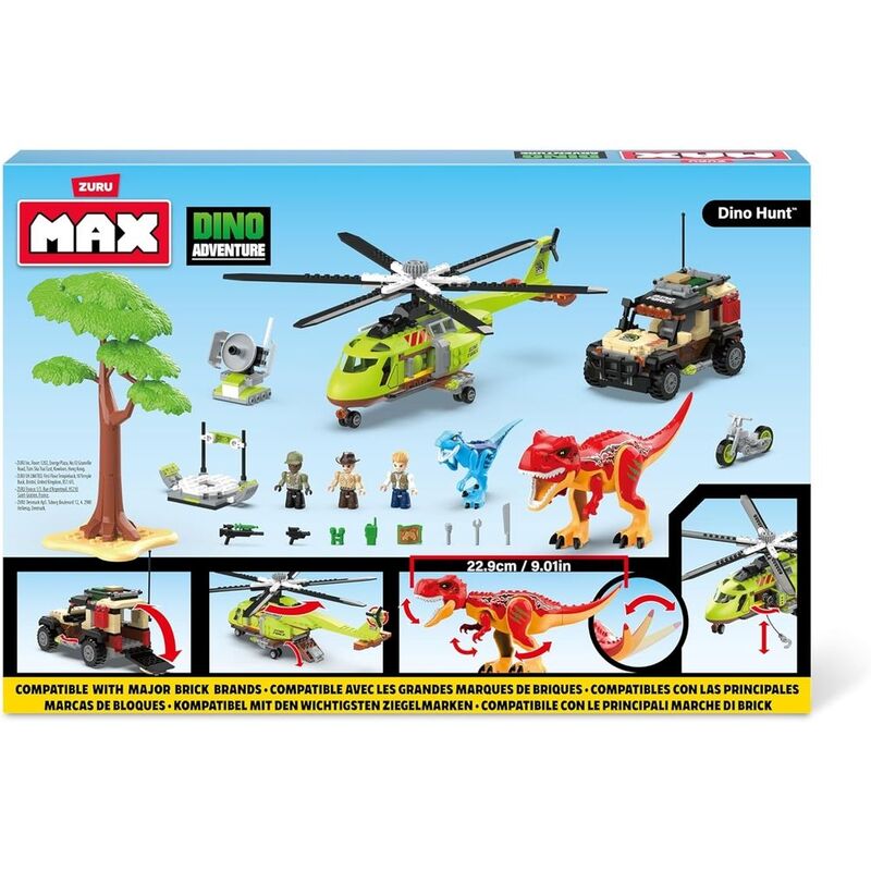 Experience your dino adventure with MAX Build More! Create the perfect prehistoric world by assembling the helicopter, truck, motorcycle, 2 dinosaurs, tree and radar! Put the figure in the truck or helicopter to hunt your gigantic dinosaurs. Release the motorcycle from the rear of the helicopter or truck for an ultimate chase. Move the dinosaur's arms to strike back!