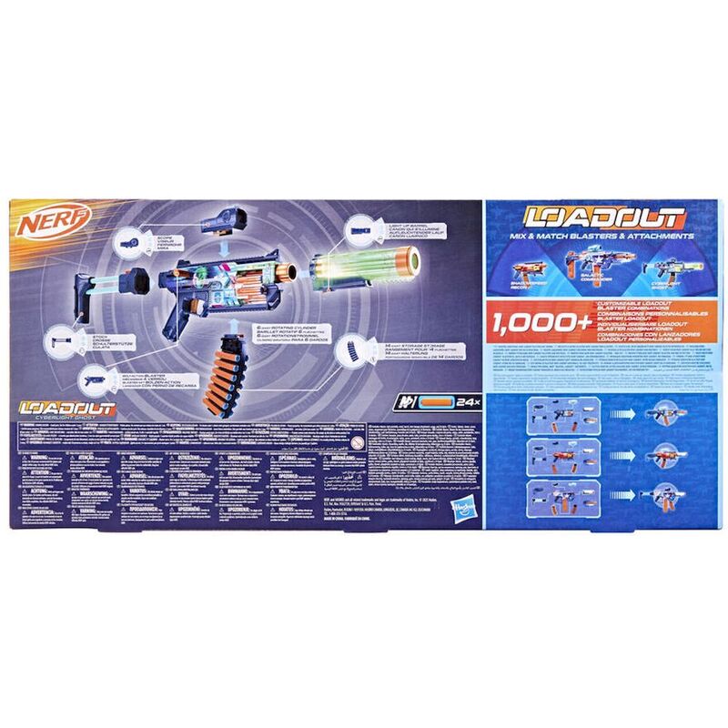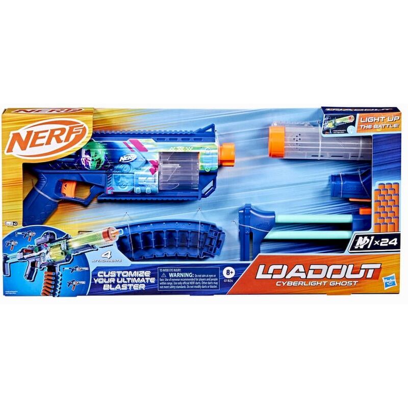 Bring video games to life and customize your ultimate blaster! NERF Loadout dart blasters include interchangeable attachments to mix and match for more than 1000 combinations! The NERF Loadout Cyberlight Ghost bolt-action blaster features built-in LED lights that make the barrel and cylinder glow! It has a 6-dart rotating cylinder and comes with a scope, stock, barrel, and dart storage attachment. The blaster is equipped with the legendary Cyberlight Ghost skin, making you ready to dive into the action of futuristic battles. The bolt can attach on either side for right-handed or left-handed players. The NERF Loadout Cyberlight Ghost blaster includes 24 NERF N1 darts designed for extreme accuracy, speed, and distance. Build your NERF Loadout blaster stockpile for endless customizable options (each sold separately, subject to availability). NERF N1 darts are compatible only with NERF N1 dart blasters. Eyewear recommended (not included).