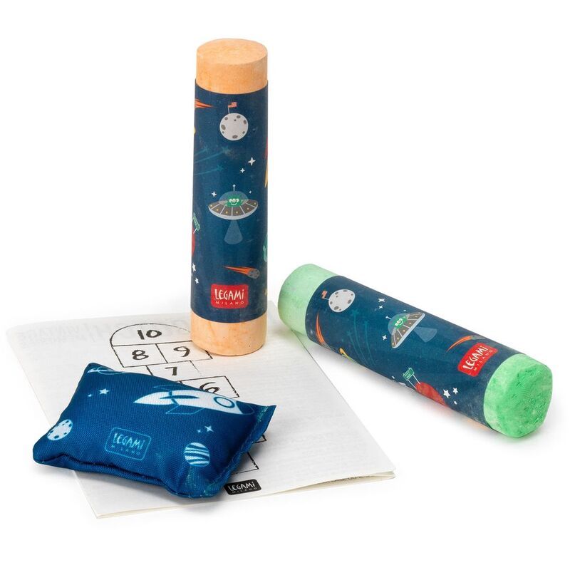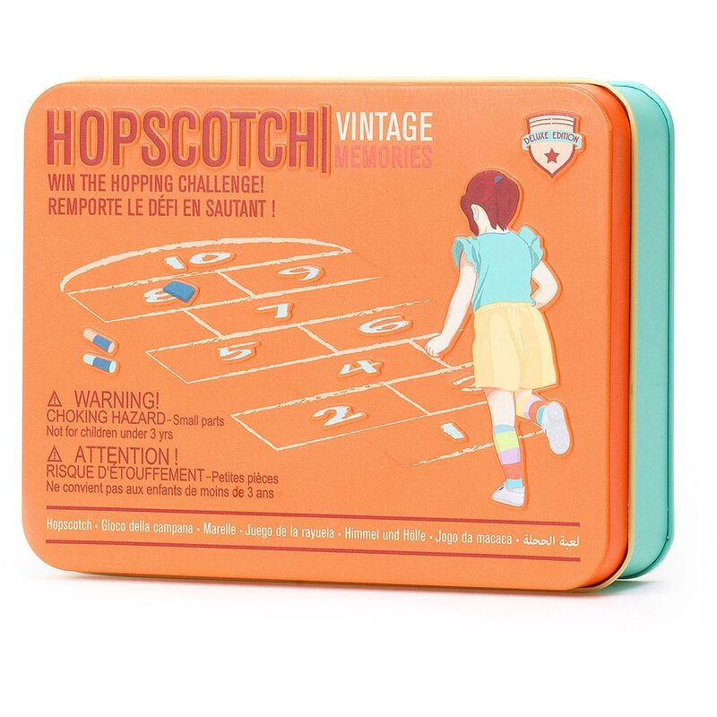 Hop to it! Rediscover Hopscotch, a timeless, vintage game. The reusable metal box contains a bean bag and 2 pieces of coloured chalk. Whether you play indoors or outdoors, remember to always follow the rules!