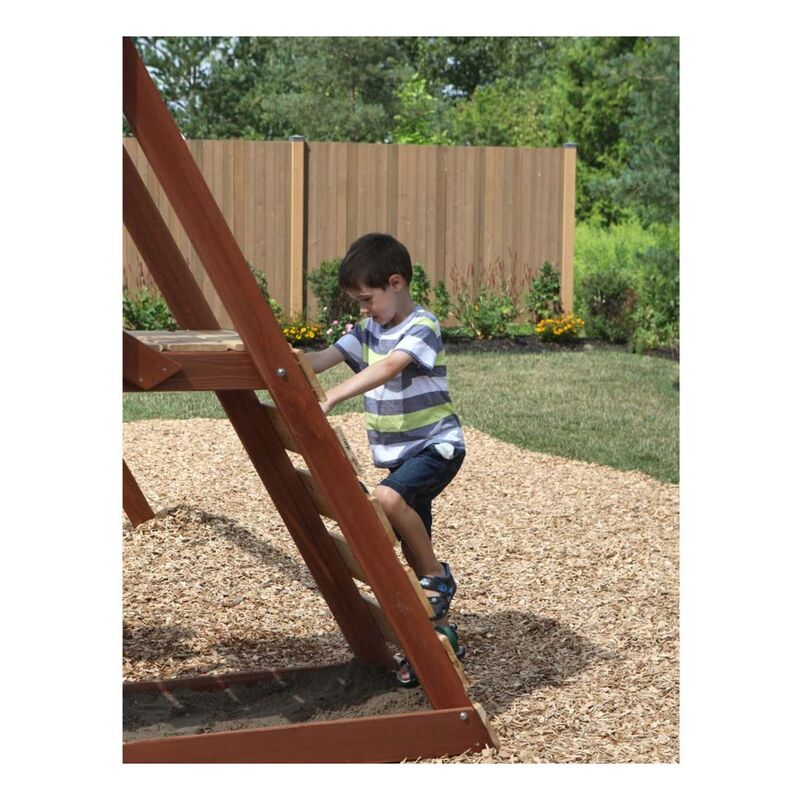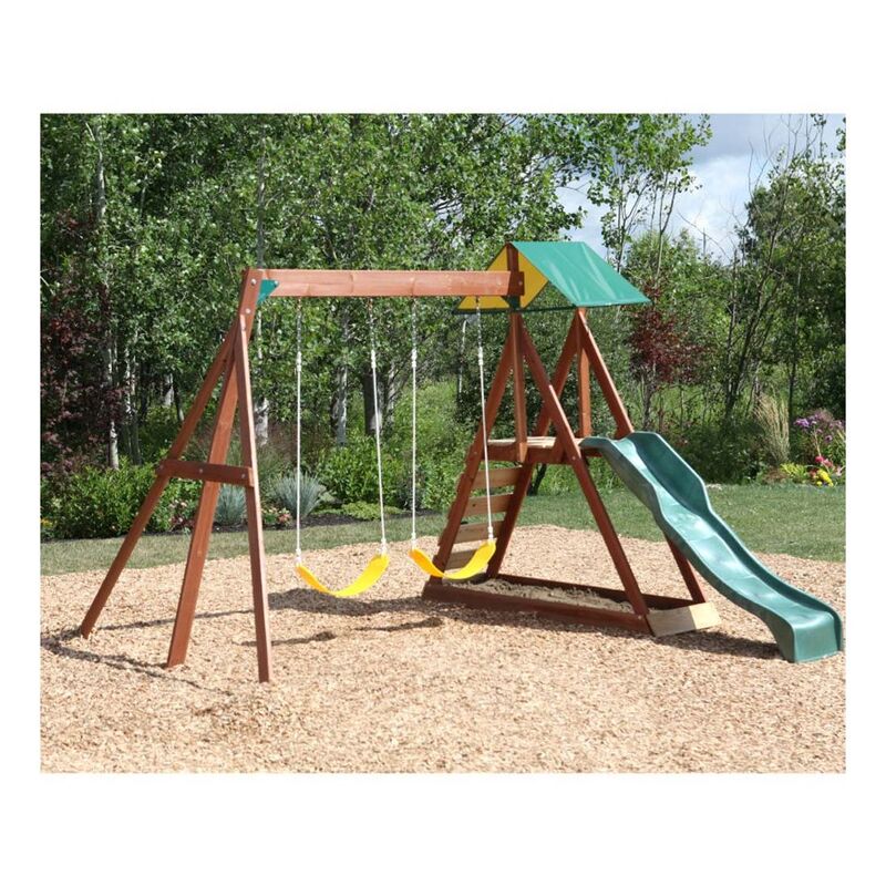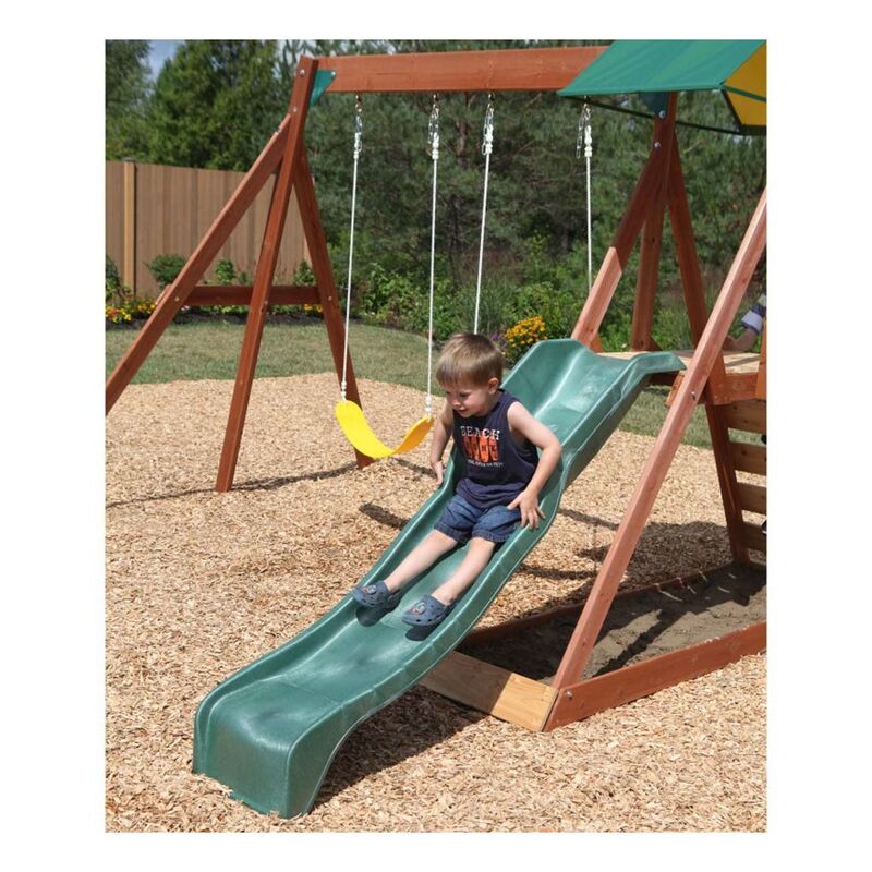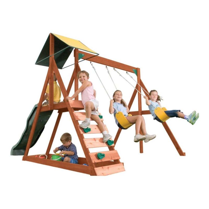 Simple and compact-yet with enough fun to keep up to four kids entertained at once-the Sunview II Playset/Swing Set by KidKraft is the perfect activity center for smaller back yards. Only slightly larger than a traditional swing set, Sunview II also has the premium features kids love, including an extra-deep high-rail wave slide, exciting rock-climbing wall, shaded upper deck and a cozy sandbox. And on top of it all, a spacious wooden swing set with a pair of sturdy belt swings that let two high-flying friends soar side-by-side. Sunview II is crafted from high-quality cedar lumber, which comes pre-cut, pre-drilled and pre-stained for easier assembly in a single box. When a swing set alone just isn't enough, the superior small-backyard solution is Sunview II by KidKraft.