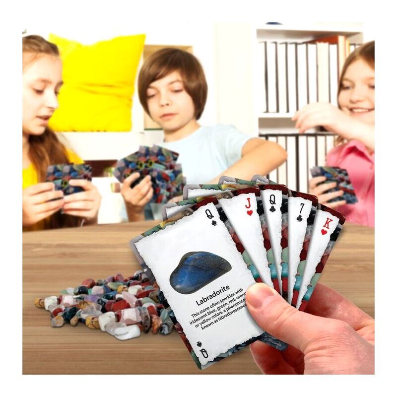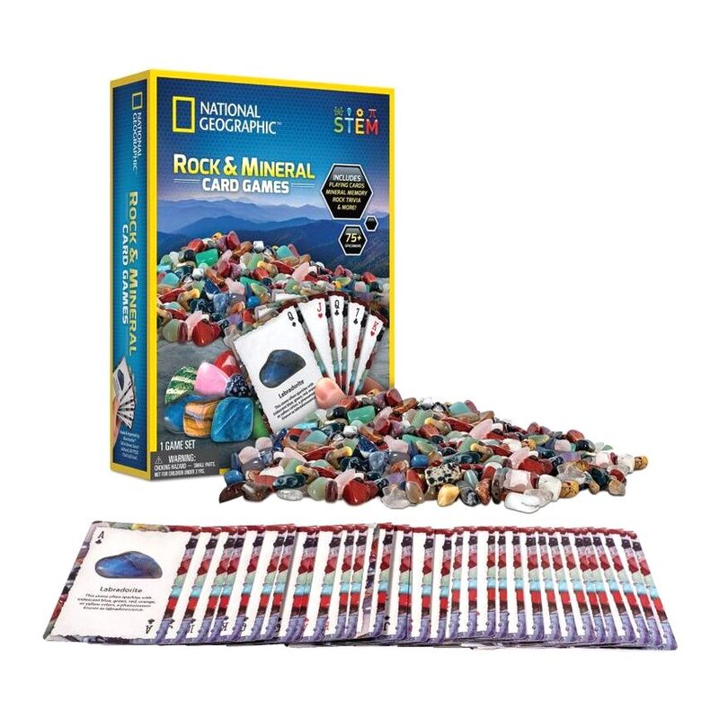 The National Geographic Rock and Mineral Playing Card Set comes with a standard 52 card deck and over 75 genuine gemstones! You can play all your favorite card games, and each card has a gemstone, rock, or mineral fact on it, making them great for trivia and memory games too. Instructions for memory and trivia games are included, as well as a convenient storage bag for all your new specimens.