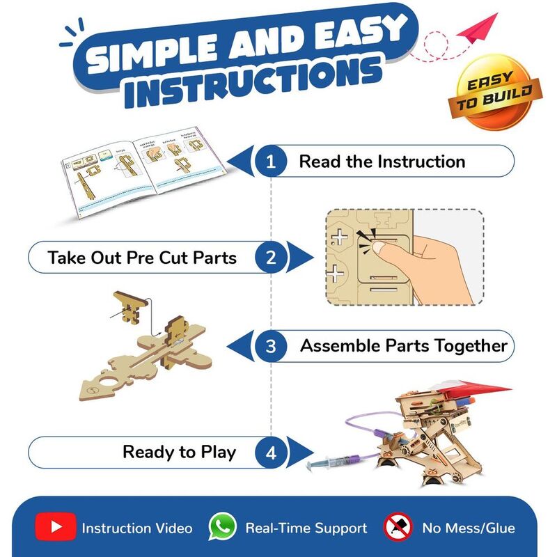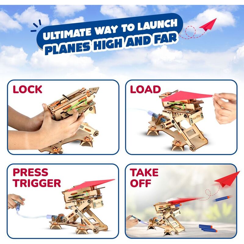 Featuring a scissor mechanism, this hydraulic plane launcher allows children to lock the trigger and securely place their paper airplane on the launcher. By simply pushing the syringe, they will witness the power of hydraulics as their paper airplane soars through the air. Through this engaging play experience, children will not only have a great time launching their airplanes but also gain a deeper understanding of the forces of flight. They will learn about the principles of aerodynamics, including lift, drag, and thrust, as they observe the performance of their paper airplanes.