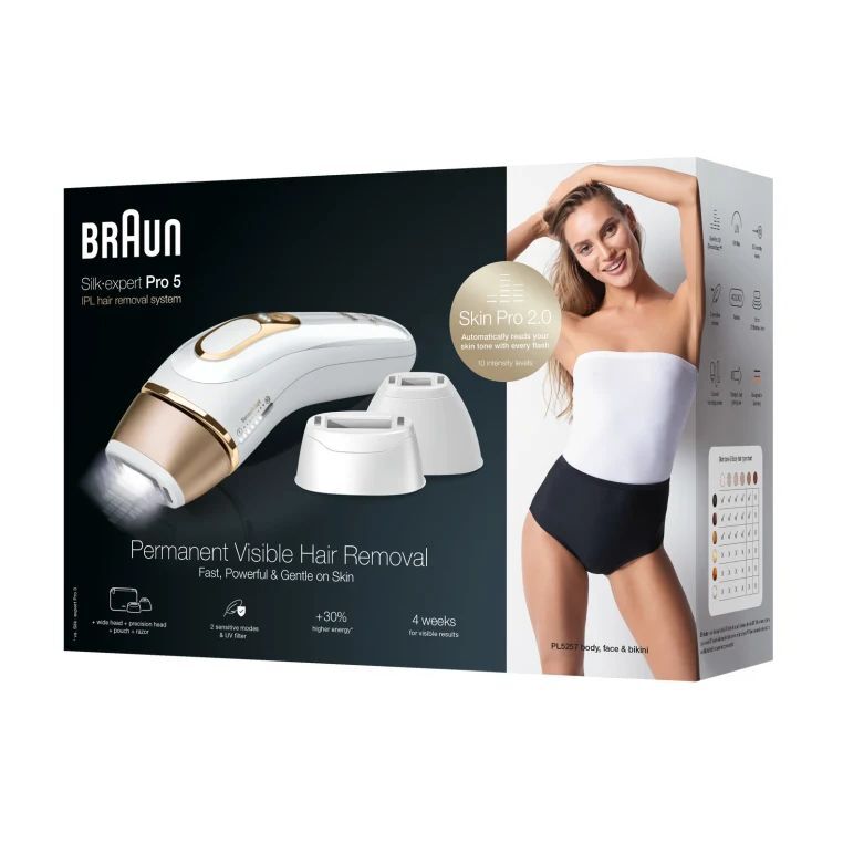 - Optimal power for every body part with SkinPro 2.0 (SensoAdapt™)—salon-like technology that automatically and continuously adapts to your skin toneFlashes up to 125 times per minute for an effortless treatment & better skin coverageGentle on skin thanks to two sensitive modes that reduce light intensity for a gentler treatment in sensitive areas like the face, armpit or bikini areasStandard, precision and wide heads for head-to-toe treatment—from legs, arms, chest and back to the face, armpit and bikini areas100 minutes of trimming. Full recharge in 1 hour. 5-minute quick charge for one trim.