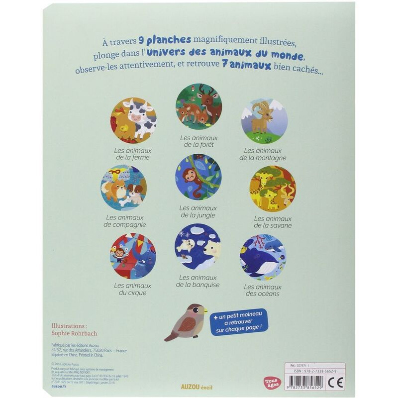 À travers 9 planches magnifiquement illustrées, découvre les animaux, observe les images et retrouve 7 éléments bien cachés !