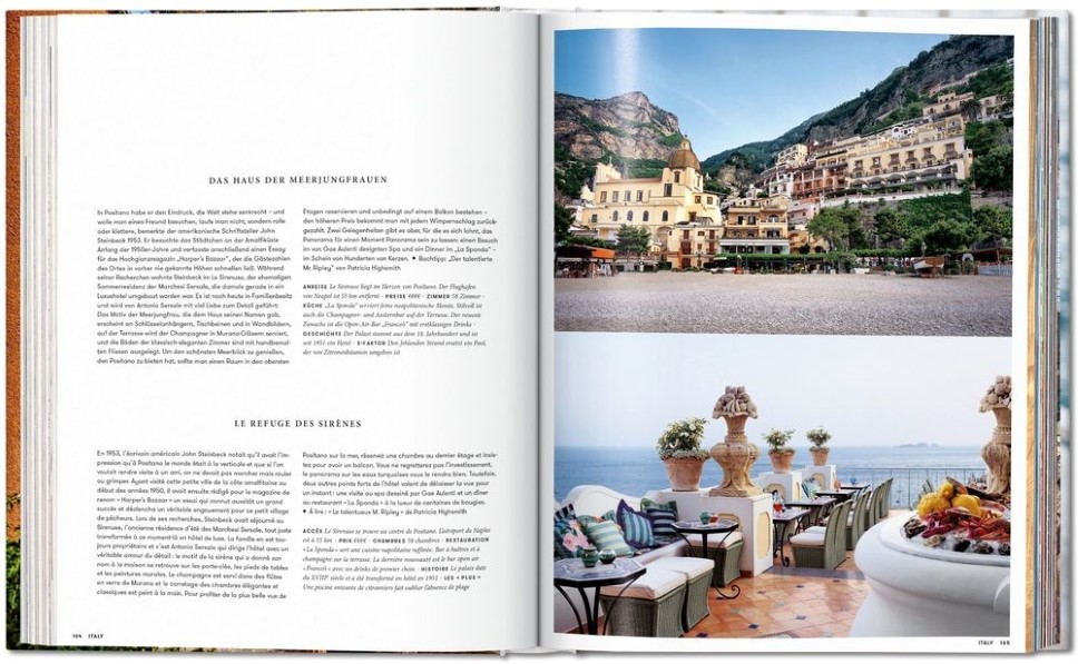 Angelika Taschen set out in search of the most beautiful hotels on a great variety of coasts, islands and beaches, taking you on a journey to the luxurious Hotel du Cap-Eden-Roc and the ultra-chic Les Roches Rouges on the Côte d'Azur, to the little-known Pardini's Hermitage on the Italian island of Giglio, which is only accessible by boat or on foot, and to Bodrum in Turkey, where the elegant Amanruya resort lies hidden in one of the most stunning bays in the Mediterranean. She also presents new hotel concepts, great architecture and creative design - for example the finca Menorca Experimental on the Balearic Islands, the modernist Villa Dubrovnik in Croatia and Dexamenes on the Peloponnese, where new life was breathed into decommissioned wine tanks.