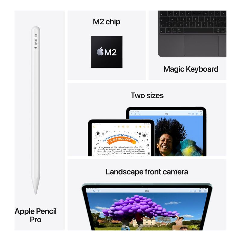 Now available in a 13-inch model, iPad Air is supercharged by the incredibly fast Apple M2 chip. It features a stunning Liquid Retina display, a new landscape camera perfect for video calls, and superfast Wi-Fi 6E and 5G. And it works with the new Apple Pencil Pro and Magic Keyboard, so you can multitask, study, work, play, and create from anywhere.