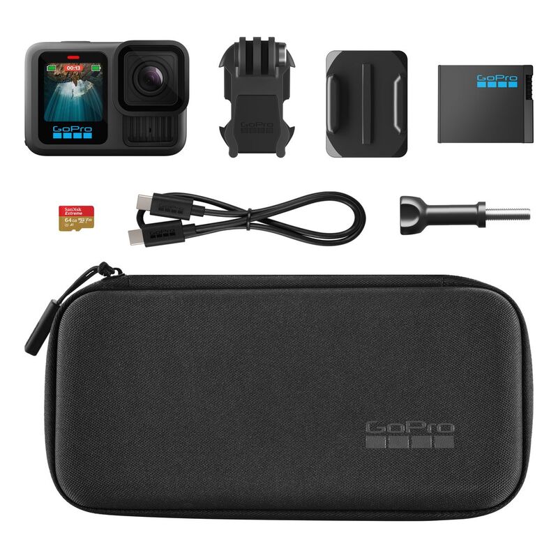 Start capturing your adventures right out of the box with our most amazing camera yet—HER013 Black—plus a 64GB SanDisk microSD card and carrying case. HERO13 Black gives you best-in-class 5.3K60 video and legendary GoPro durability, and is compatible with new HB-Series Lenses.1 These lenses expand your capture capabilities for the most immersive POV shots, the ability to focus closer than ever, easy-to-achieve motion blur using neutral density filters and cinematic anamorphic footage. A new more powerful Enduro battery extends recording time in all weather conditions, while an updated mounting system gives HERO13 Black more mounting flexibility than any GoPro before it. With essential GoPro features including award-winning HyperSmooth 6.0 video stabilization, automatic highlight videos and the ability to auto upload your footage to the cloud,2 HERO13 Black is a powerful combination of leading-edge tech and endless creative possibilities.