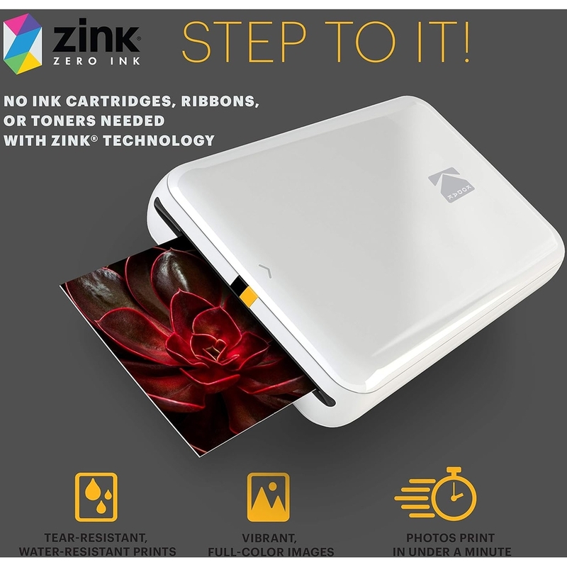 Step Up Your Printing Game Now, with the KODAK Step Portable Printer, printing full-color photographs is faster and easier than ever. Just pair with any Bluetooth- or NFC-enabled smart device, and this Kodak photo printer will give you stunning full-color photo prints in under 60 seconds. Kodak Step mini photo printer connects to any iOS or android smartphone, tablet, or similar device.This mini printer ZINK Zero Ink Paper technology eliminates the need for expensive inks, toners, and ribbons, delivering cool 2”x3” photographs you can peel and stick to any surface. Photos printed with this portable photo printer come out clear, bright, colorful and covered with an extra layer of protective coating to prevent smudges, rips, and water damage. The pocket printer uses the KODAK app that lets you customize photos far beyond the usual ‘flip’ and ‘rotate’ of your smartphone. Use our extensive editing tools to apply flattering filters, cutesy stickers, decorative frames, and other personalized flair. Stop waiting and start printing with this portable wireless printer from Kodak.