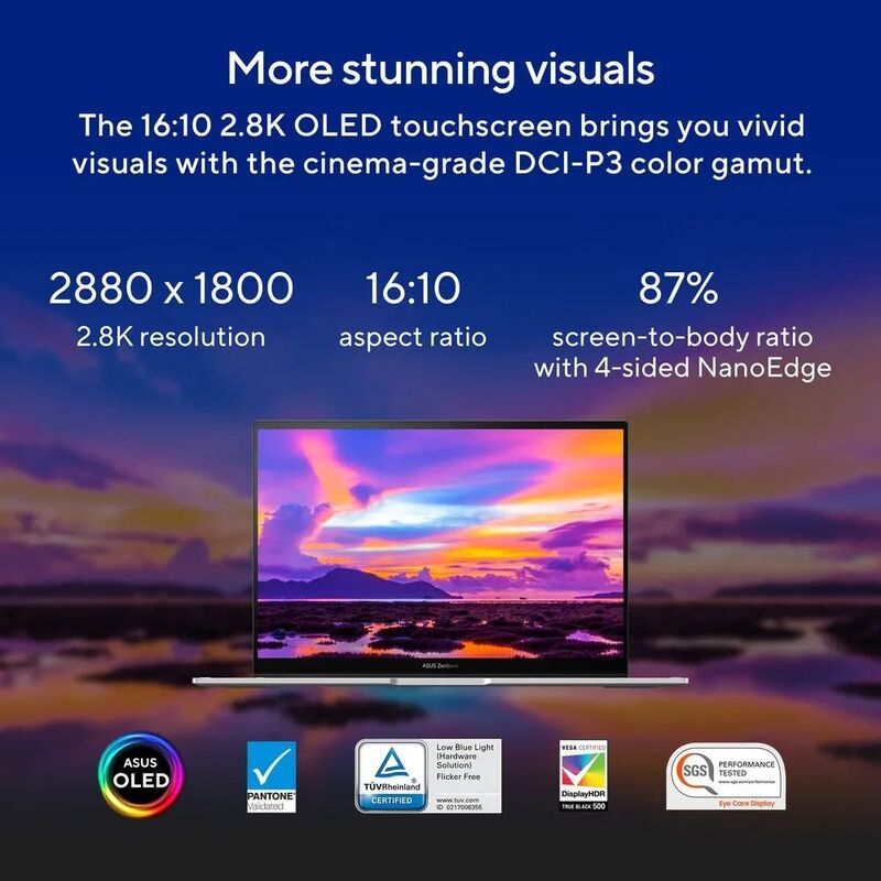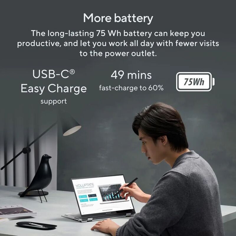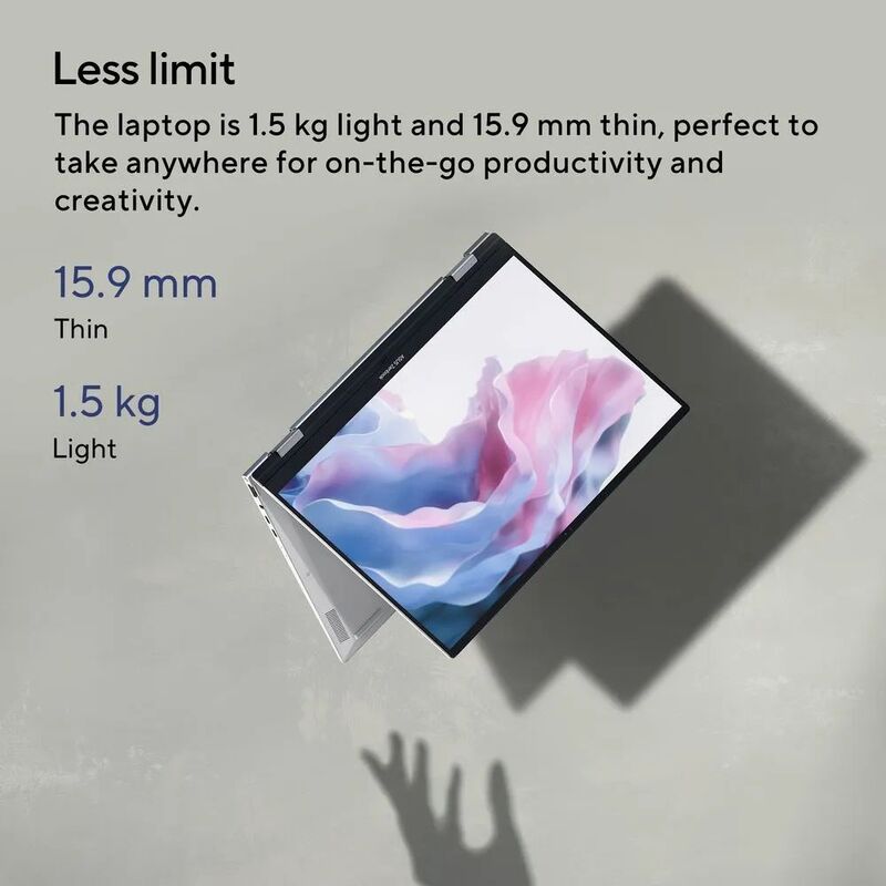 The versatile Zenbook 14 Flip OLED is everything you need for your busy on-the-go lifestyle. Its compact and elegant chassis now packs a bigger 14-inch 16:10 2.8K OLED HDR touchscreen with superb PANTONE® Validated color-accurate visuals, and it supports a 4096-pressure-level MPP 2.0 stylus for natural input. Powered by the latest 13th Gen Intel Core CPUs, Zenbook 14 Flip OLED has a class-leading 75 Wh battery, and its 1.5 kg-light chassis is just 15.9 mm thin, with a 360° any-position hinge for effortless versatility. There’s a powerful Harman Kardon-certified Dolby Atmos® sound system for awesome audio and crystal-clear conferencing. Zenbook 14 Flip OLED gives you more power and more versatility!
