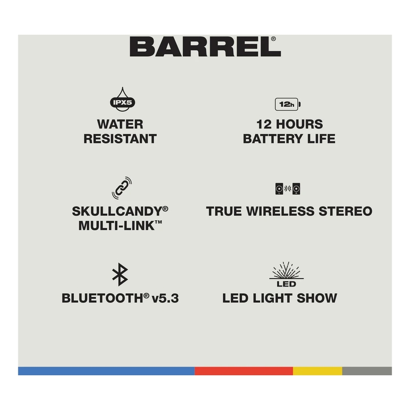 Most portable speakers leave you wishing for more. Not Barrel. This is a full-frequency Bluetooth speaker with beautiful, bright highs, rich mids and deep, punchy bass. Barrel has the audio chops to handle a house party on its own plus the convenience of total portability, water-resistant construction, Skullcandy Multi-Link and an LED light show.