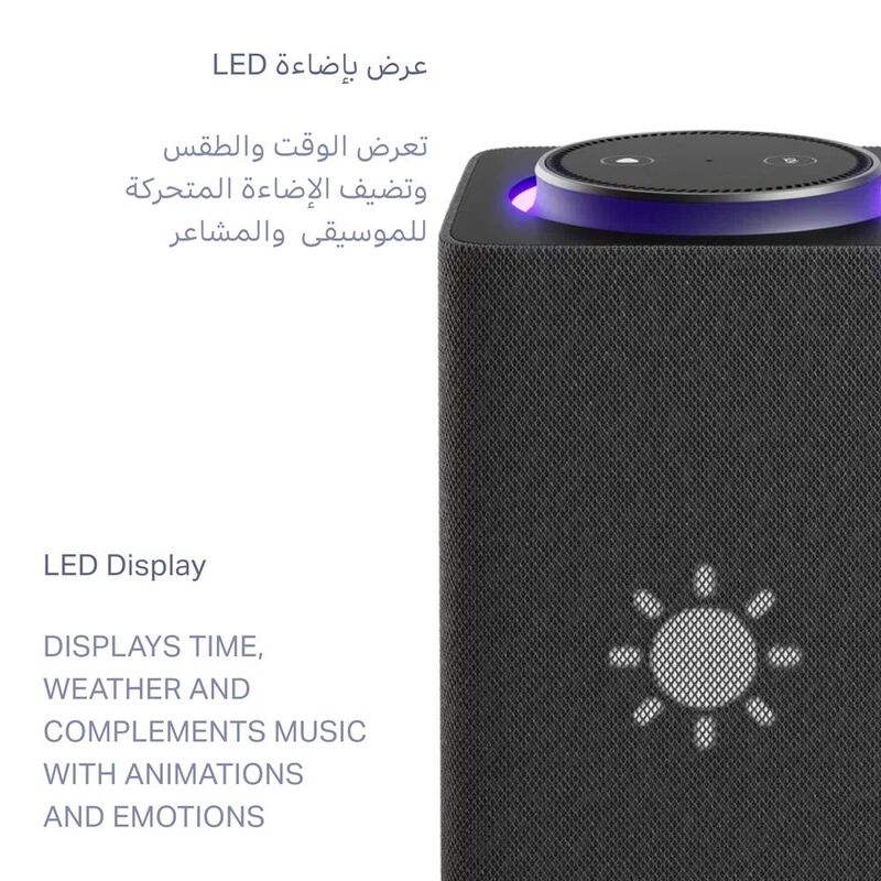 • When YASMINA is not busy with anything, the LED screen shows the time or weather. And when you talk to her, she complements the answers with animation and expresses emotions. Say something nice to YASMINA and she'll wink at you.