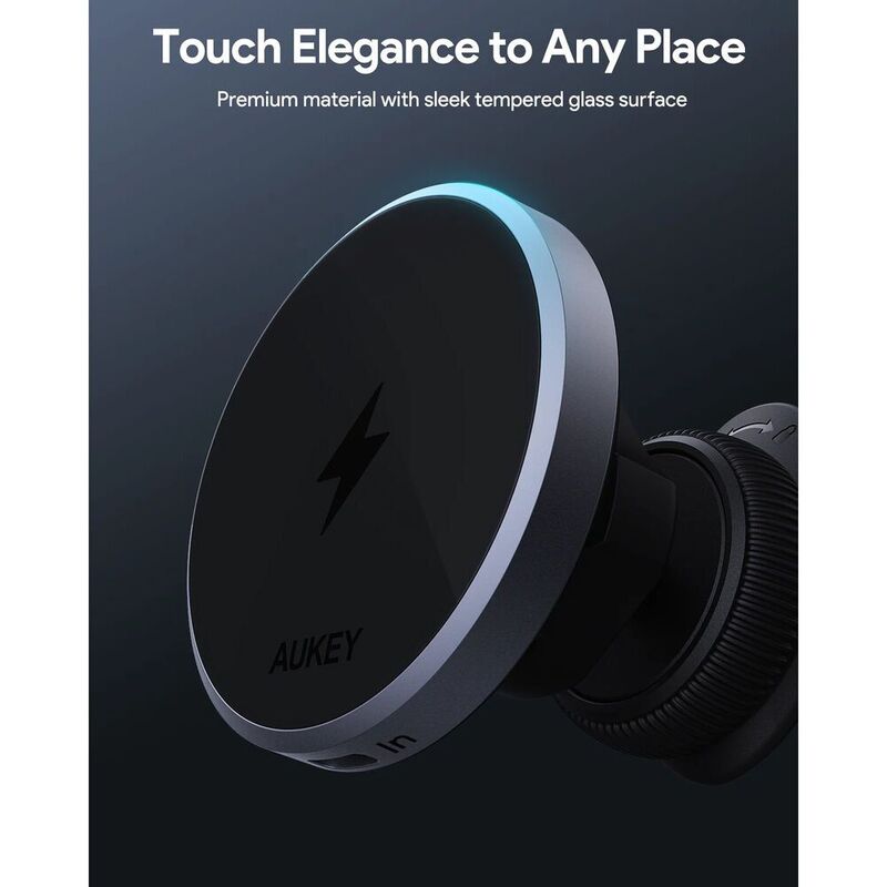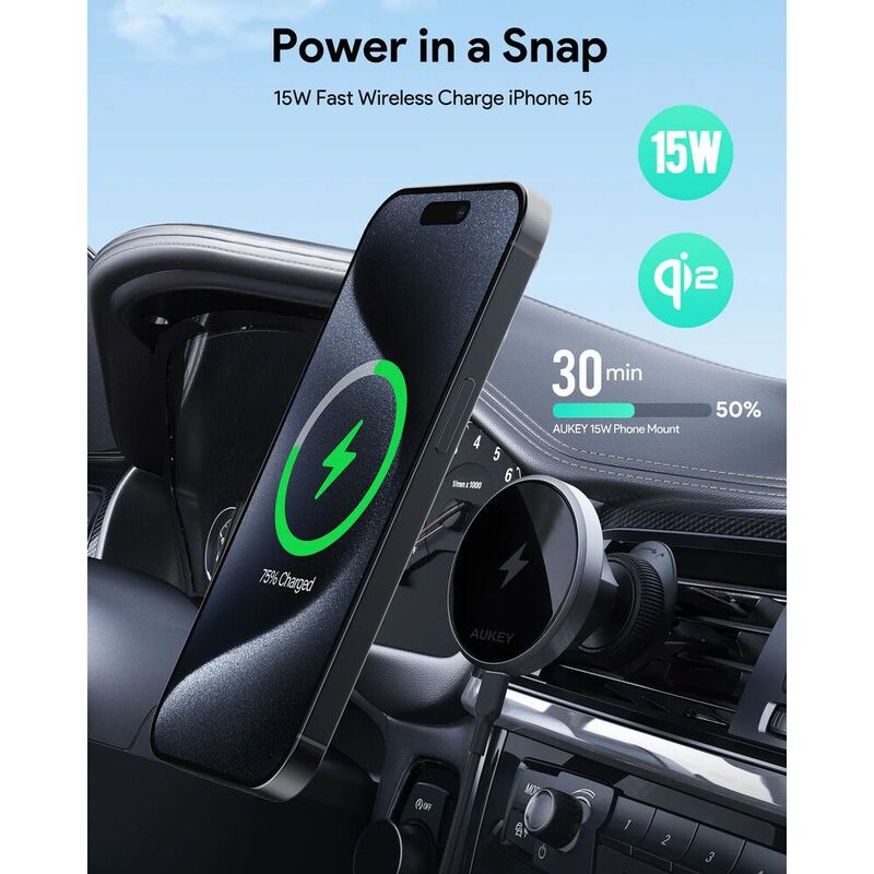 Conveniently mount and charge your phone while on the road with this 15W Qi2 Wireless Car Vent Charging Mount from AUKEY. Designed to withstand bumpy roads, this charger securely attaches to your car's air vent with a vent hook mechanism, while your phone clicks strongly to the tempered glass charging pad via powerful N52 magnets. The pad is MagSafe friendly but any phone can use it with an optional adhesive magnetic ring. With no clamps needed, your phone can be placed in any orientation and an integrated ball head allows for fine adjustments to optimize viewing angle and reduce glare. Connect an optional USB-C cable and charger to supple the Qi2-compatible pad with up to 15W of fast charging power.