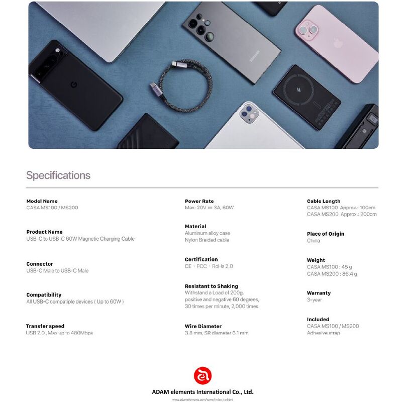 ADAM elements CASA MS200 USB-C to USB-C 60W Magnetic Charging Cable 2m - Black