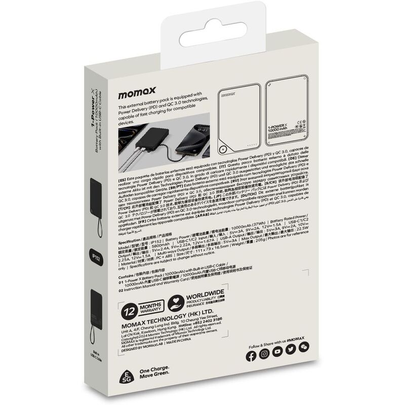 Momax 1-Power X 10000mAh Power Bank With Built-In USB-C Cable - Black