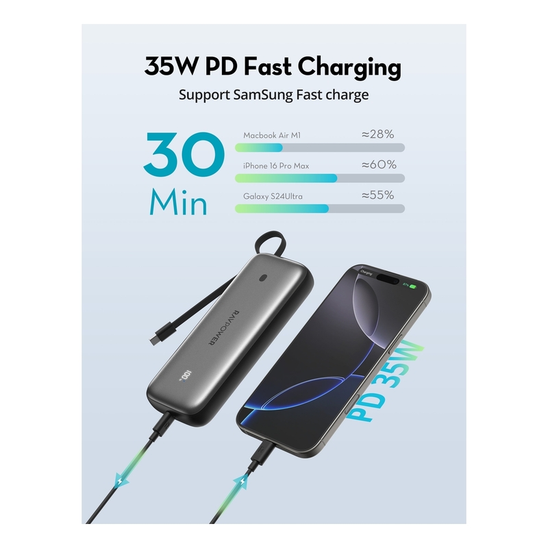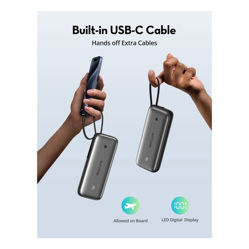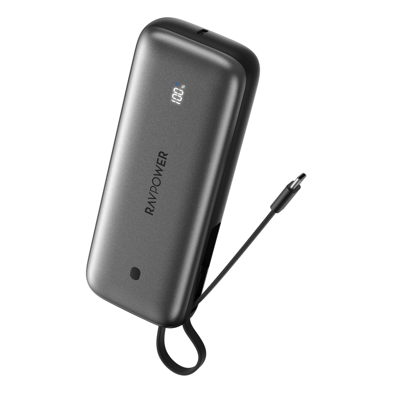 Ravpower RB-PB1224 Pro PD Pioneer 20000mAh 30W 3-Port Built-In USB-C Cable Power Bank - Grey