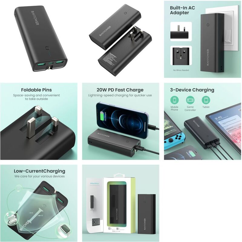 Ravpower RP-RP243 10000mAh 3-Ports With Power Bank UK Plug - Black