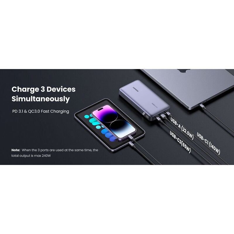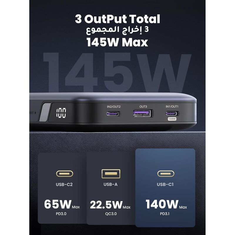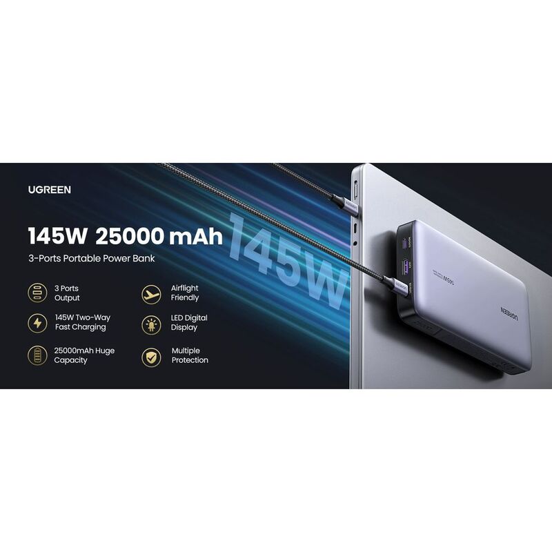 - 145W High-speed Charging :UGREEN Portable Charger Equipped with PD3.0, QC3.0, and capable of 145W of fast charging speed for your Laptop! Fully charge a 2022 13" Macbook Air in 90 minutes, boost up 50% battery to your iPhone 15 in 20 minutes.